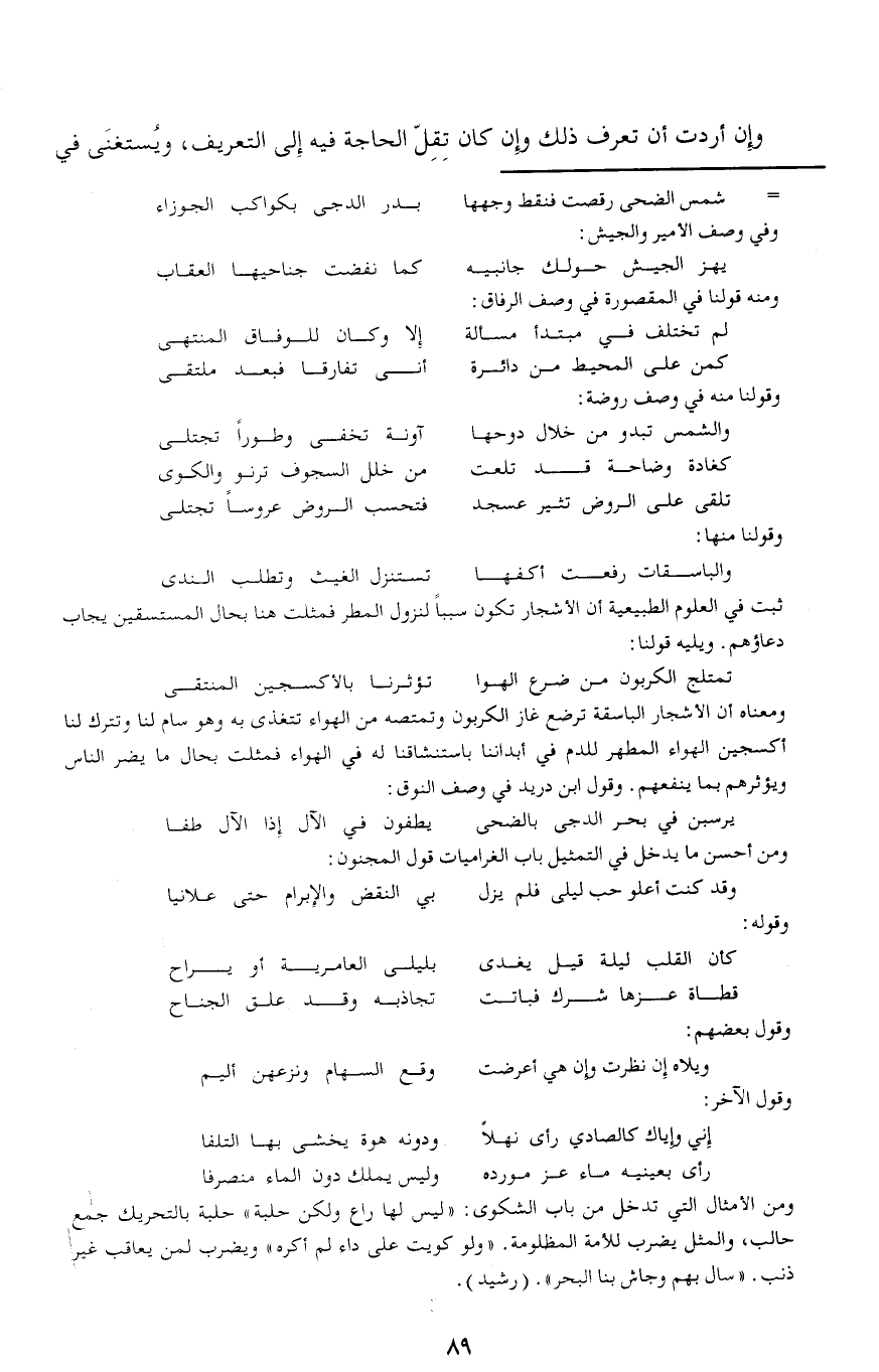ومعناه أن الأشجار الباسقة ترضع غاز الكربون وتمتصه من الهواء تتغذى به وهو سام لنا وتترك لنا أكسجين الهواء المطهر للدم في أبداننا باستنشاقنا له في الهواء فمثلت بحال ما يضر الناس ويؤثرهم بما ينفعهم. وقول ابن دريد في وصف النوق: