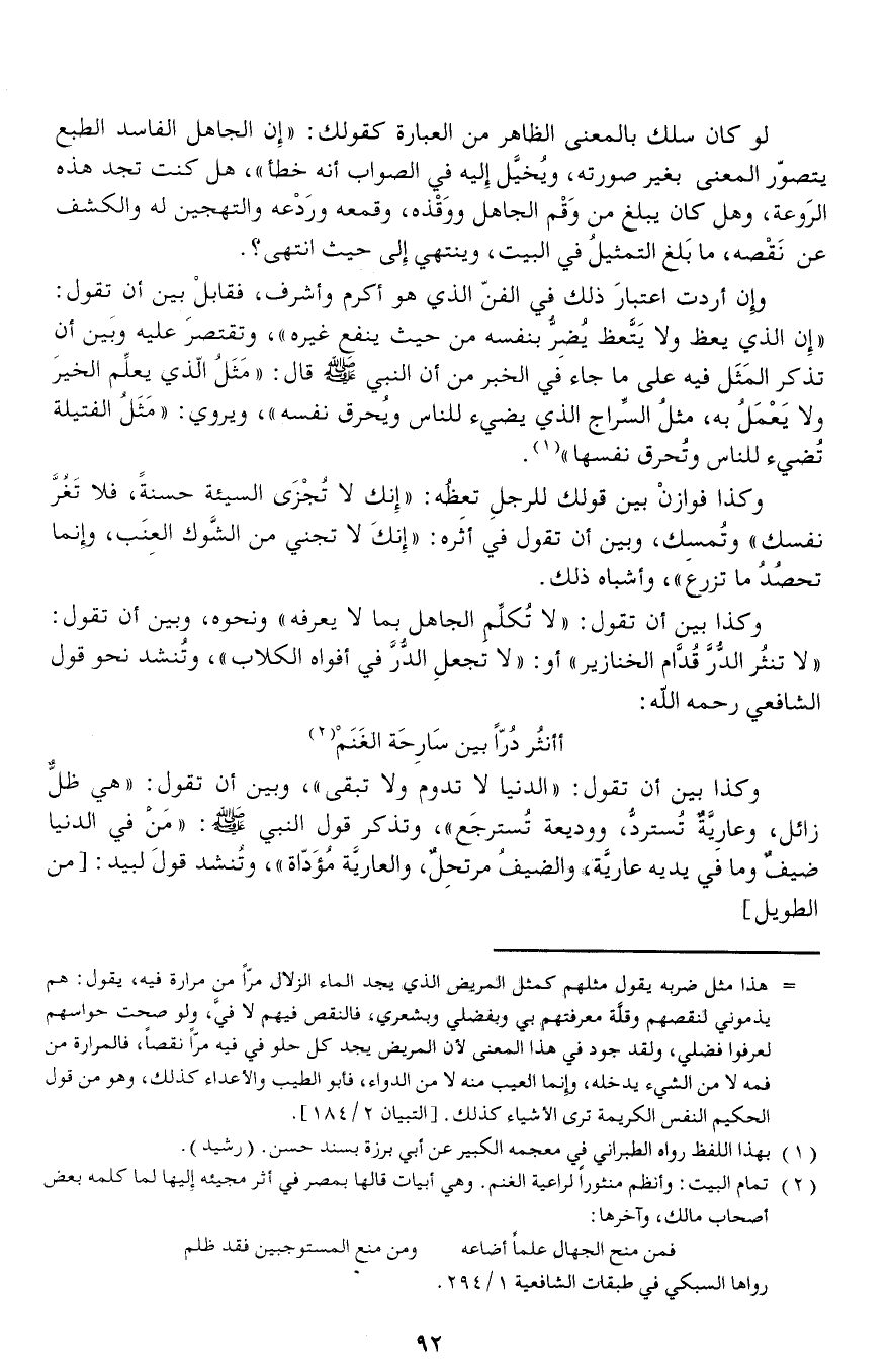 أأنثر درّا بين سارحة الغنم (¬2) وكذا بين أن تقول: «الدنيا لا تدوم ولا تبقى»، وبين أن تقول: «هي ظلّ زائل، وعاريّة تستردّ، ووديعة تسترجع»، وتذكر قول النبي صلّى الله عليه وسلّم: «من في الدنيا ضيف وما في يديه عاريّة، والضيف مرتحل، والعاريّة مؤدّاة»، وتنشد قول لبيد: [من الطويل]