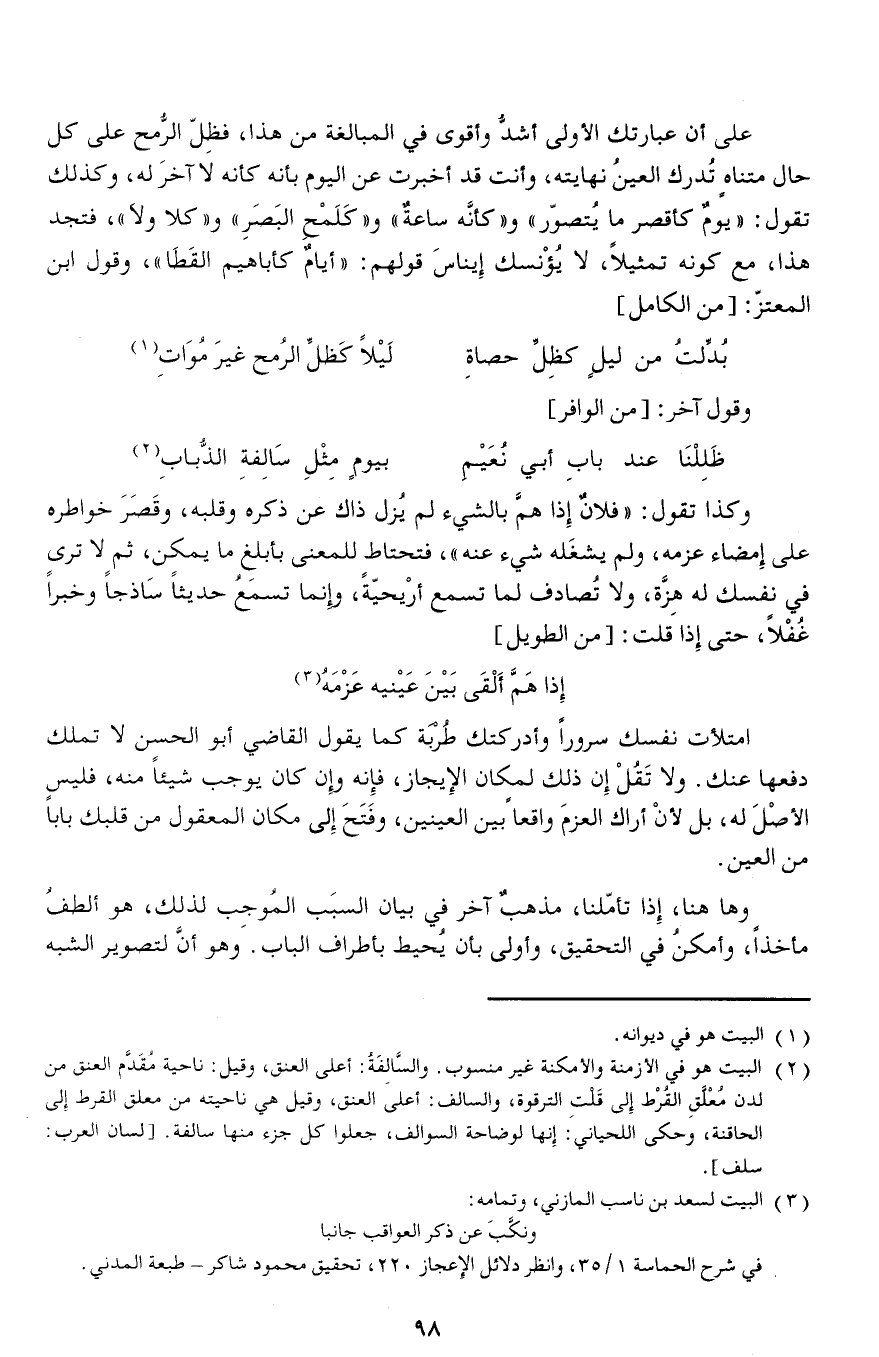 على أن عبارتك الأولى أشدّ وأقوى في المبالغة من هذا، فظلّ الرّمح على كل حال متناه تدرك العين نهايته، وأنت قد أخبرت عن اليوم بأنه كأنه لا آخر له، وكذلك تقول: «يوم كأقصر ما يتصوّر» و «كأنّه ساعة» و «كلمح البصر» و «كلا ولا»، فتجد هذا، مع كونه تمثيلا، لا يؤنسك إيناس قولهم: «أيام كأباهيم القطا»، وقول ابن المعتزّ: [من الكامل]
