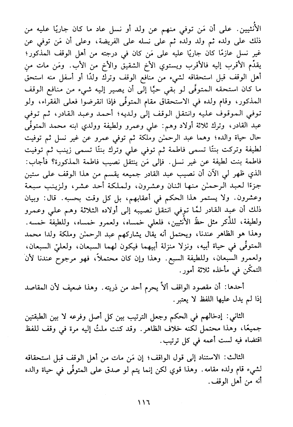 وَهَذَا هُوَ الظَّاهِرُ عِنْدَنَا، وَيُحْتَمَلُ أَنْ يُقَالَ يُشَارِكُهُمْ عَبْدُ الْقَادِرِ وَمَلَكَةُ وَلَدَا مُحَمَّدٍ الْمُتَوَفَّى فِي حَيَاةِ أَبِيهِ، وَنَزَلَا مَنْزِلَةَ أَبِيهِمَا فَيَكُونُ لَهُمَا السُّبُعَانِ، وَلِعَلِيٍّ السُّبُعَانِ، وَلِعَمْرٍو السُّبُعَانِ، وَلِلَطِيفَةَ السُّبُعُ.