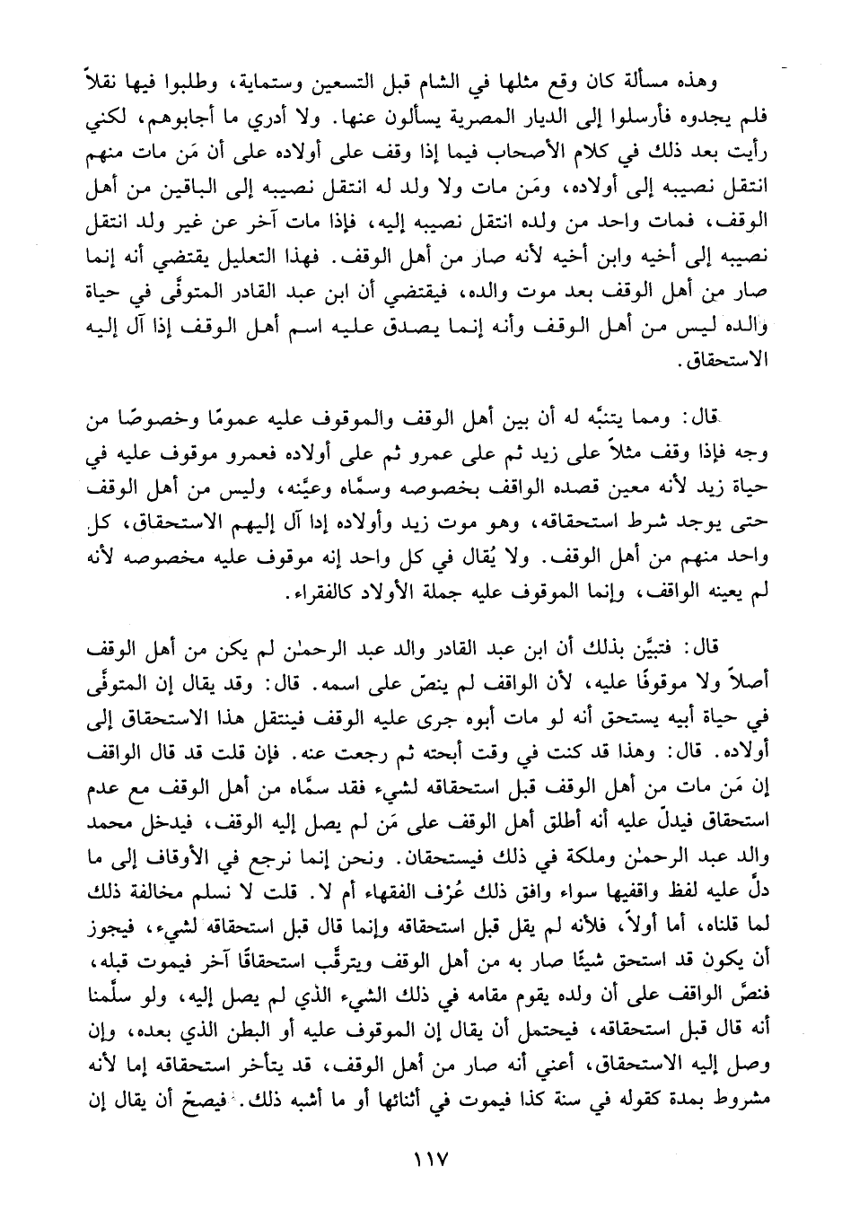 قَالَ: فَتَبَيَّنَ بِذَلِكَ أَنَّ ابْنَ عَبْدِ الْقَادِرِ وَالِدِ عَبْدِ الرَّحْمَنِ لَمْ يَكُنْ مِنْ أَهْلِ الْوَقْفِ أَصْلًا وَلَا مَوْقُوفًا عَلَيْهِ، لِأَنَّ الْوَاقِفَ لَمْ يَنُصَّ عَلَى اسْمِهِ.