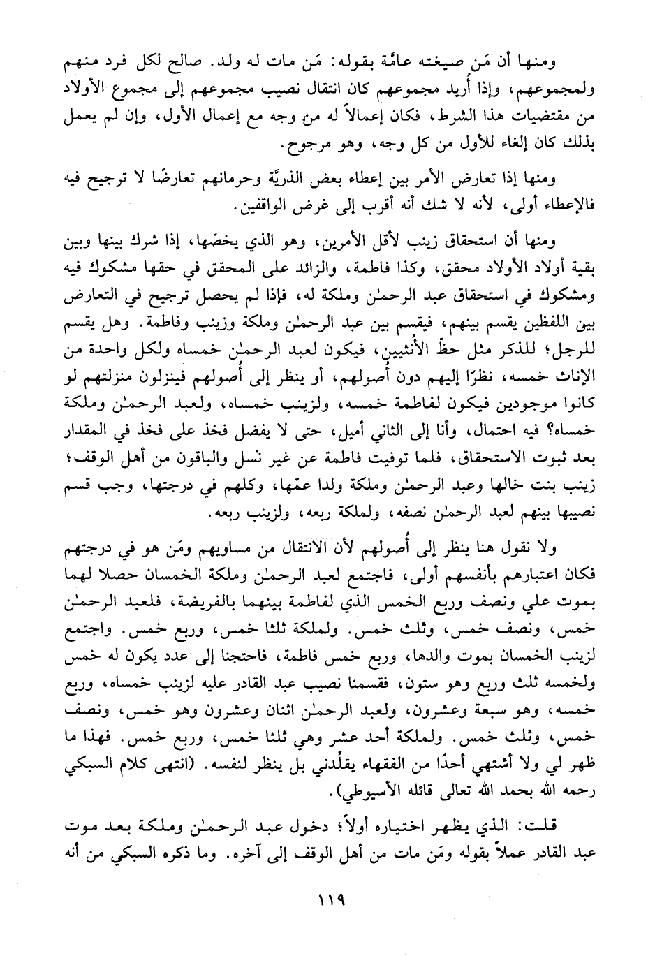 قُلْتُ قَائِلُهُ الْأُسْيُوطِيُّ الَّذِي يَظْهَرُ اخْتِيَارُهُ أَوَّلًا؛ دُخُولُ عَبْدِ الرَّحْمَنِ وَمَلَكَةَ بَعْدَ مَوْتِ عَبْدِ الْقَادِرِ عَمَلًا بِقَوْلِهِ: وَمَنْ مَاتَ مِنْ أَهْلِ الْوَقْفِ إلَى آخِرِهِ.