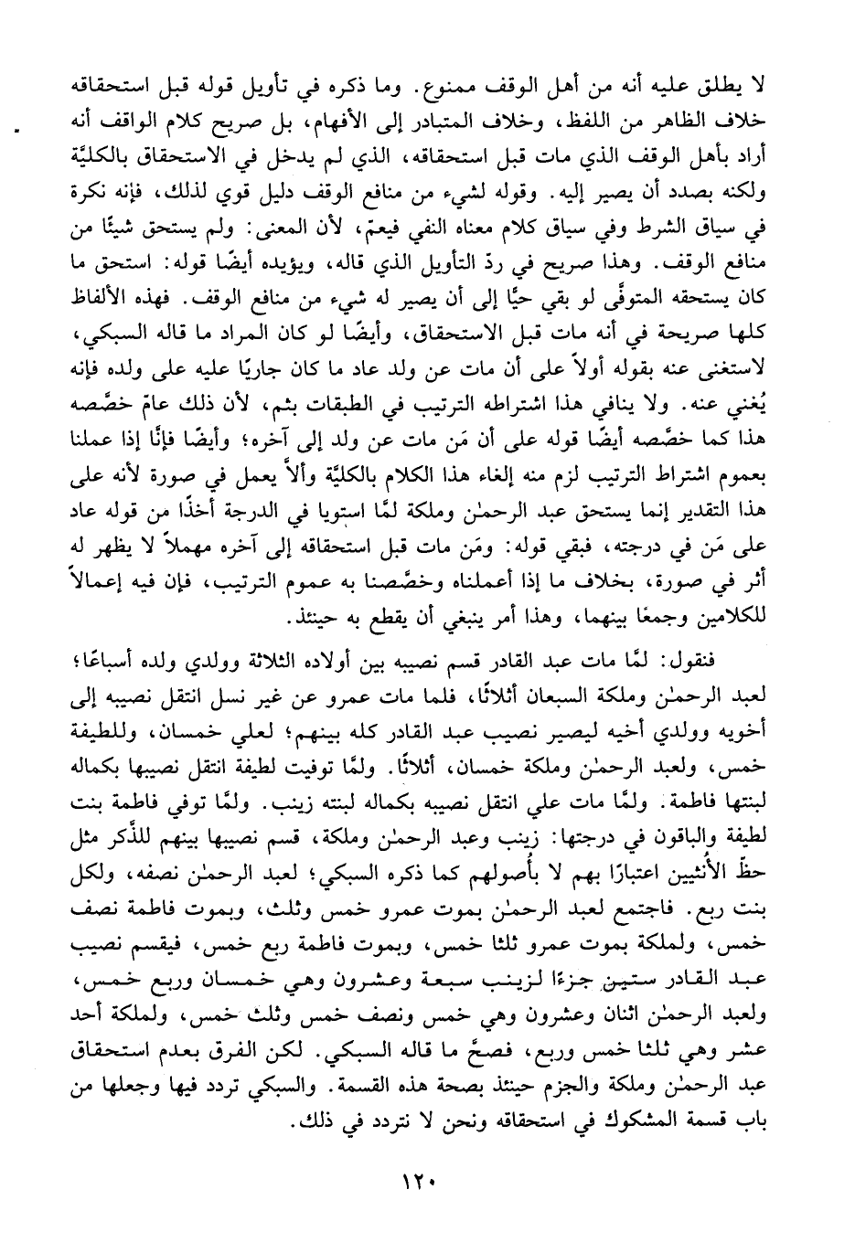 وَلَمَّا تُوُفِّيَتْ فَاطِمَةُ بِنْتُ لَطِيفَةَ وَالْبَاقُونَ فِي دَرَجَتِهَا: زَيْنَبُ وَعَبْدُ الرَّحْمَنِ وَمَلَكَةُ، قُسِّمَ نَصِيبُهَا بَيْنَهُمْ لِلذَّكَرِ مِثْلُ حَظِّ الْأُنْثَيَيْنِ اعْتِبَارًا بِهِمْ لَا بِأُصُولِهِمْ كَمَا ذَكَرَهُ السُّبْكِيُّ، لِعَبْدِ الرَّحْمَنِ نِصْفُهُ، وَلِكُلِّ بِنْتٍ رُبْعٌ.