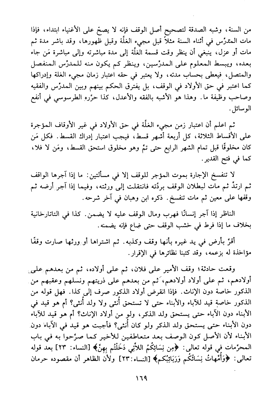 مِنْ السَّنَةِ، وَشَبَهَ الصَّدَقَةِ لِتَصْحِيحِ أَصْلِ الْوَقْفِ فَإِنَّهُ لَا يَصِحُّ عَلَى الْأَغْنِيَاءِ ابْتِدَاءً، فَإِذَا مَاتَ الْمُدَرِّسُ فِي أَثْنَاءِ السَّنَةِ مَثَلًا قَبْلَ مَجِيءِ الْغَلَّةِ وَقَبْلَ ظُهُورِهَا، وَقَدْ بَاشَرَ مُدَّةً ثُمَّ مَاتَ أَوْ عُزِلَ، يَنْبَغِي أَنْ يُنْظَرَ وَقْتَ قِسْمَةِ الْغَلَّةِ إلَى مُدَّةِ مُبَاشَرَتِهِ وَإِلَى مُبَاشَرَةِ مَنْ جَاءَ مِنْ بَعْدِهِ، وَيُبْسَطُ الْمَعْلُومُ عَلَى الْمُدَرِّسَيْنِ، وَيُنْظَرُ كَمْ يَكُونُ مِنْهُ لِلْمُدَرِّسِ الْمُنْفَصِلِ وَالْمُتَّصِلِ، فَيُعْطَى بِحِسَابِ مُدَّتِهِ، وَلَا يُعْتَبَرُ فِي حَقِّهِ اعْتِبَارُ زَمَانِ مَجِيءِ الْغَلَّةِ وَإِدْرَاكِهَا كَمَا اُعْتُبِرَ فِي حَقِّ الْأَوْلَادِ فِي الْوَقْفِ، بَلْ يَفْتَرِقُ الْحُكْمُ بَيْنَهُمْ وَبَيْنَ الْمُدَرِّسِ وَالْفَقِيهِ وَصَاحِبِ وَظِيفَةٍ مَا وَهَذَا هُوَ الْأَشْبَهُ بِالْفِقْهِ وَالْأَعْدَلُ.
