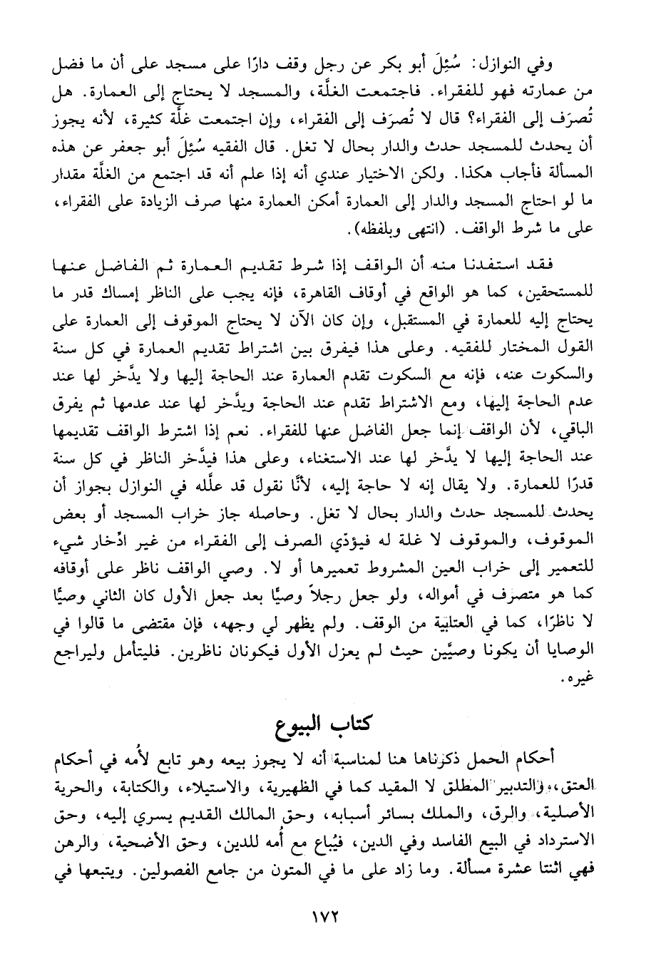 وَفِي النَّوَازِلِ: سُئِلَ أَبُو بَكْرٍ عَنْ رَجُلٍ وَقَفَ دَارًا عَلَى مَسْجِدٍ عَلَى أَنَّ مَا فَضَلَ مِنْ عِمَارَتِهِ فَهُوَ لِلْفُقَرَاءِ، فَاجْتَمَعَتْ الْغَلَّةُ، وَالْمَسْجِدُ لَا يَحْتَاجُ إلَى الْعِمَارَةِ.