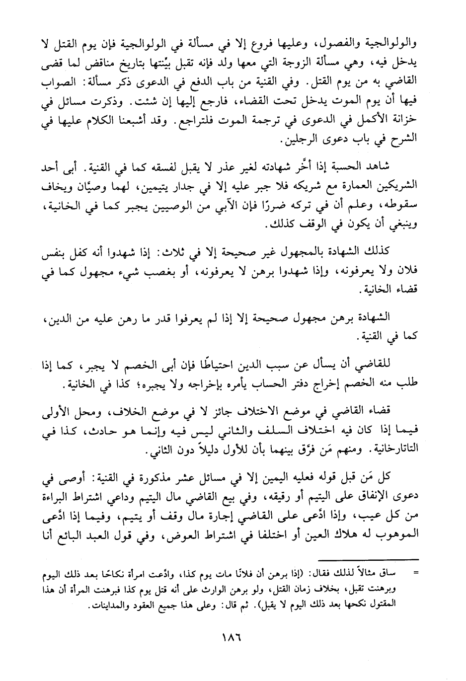 وَالْوَلْوالِجِيَّة وَالْفُصُولِ، وَعَلَيْهَا فُرُوعٌ إلَّا فِي مَسْأَلَةٍ فِي الْوَلْوَالِجيَّةِ فَإِنَّ يَوْمَ الْقَتْلِ لَا يَدْخُلُ فِيهِ، وَهِيَ مَسْأَلَةُ الزَّوْجَةِ الَّتِي مَعَهَا وَلَدٌ فَإِنَّهُ تُقْبَلُ بَيِّنَتُهَا بِتَارِيخٍ مُنَاقِضٍ لِمَا قَضَى الْقَاضِي بِهِ مِنْ يَوْمِ الْقَتْلِ.