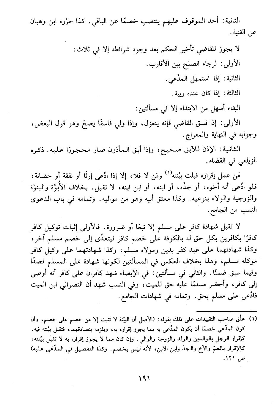 كَذَا حَرَّرَهُ ابْنُ وَهْبَانَ عَنْ الْقُنْيَةِ لَا يَجُوزُ لِلْقَاضِي تَأْخِيرُ الْحُكْمِ بَعْدَ وُجُودِ شَرَائِطِهِ إلَّا فِي ثَلَاثٍ: الْأُولَى: لِرَجَاءِ الصُّلْحِ بَيْنَ الْأَقَارِبِ.
