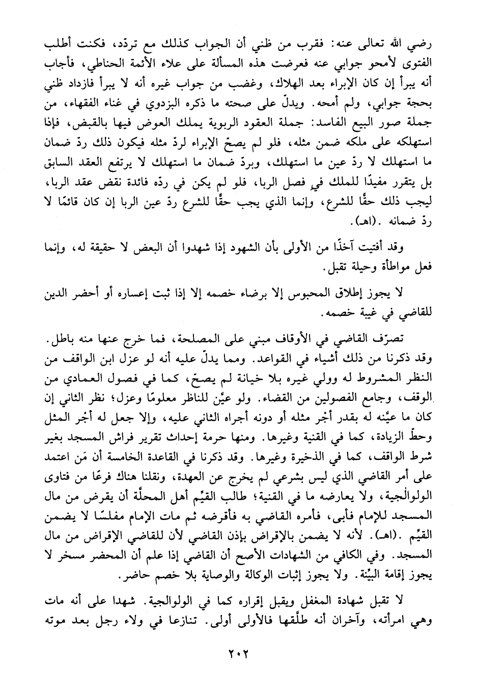 وَقَدْ أَفْتَيْتُ آخِذًا مِنْ الْأُولَى بِأَنَّ الشُّهُودَ إذَا شَهِدُوا أَنَّ الْبَعْضَ لَا حَقِيقَةَ لَهُ، وَإِنَّمَا فُعِلَ مُوَاطَأَةً وَحِيلَةً تُقْبَلُ. لَا يَجُوزُ إطْلَاقُ الْمَحْبُوسِ إلَّا بِرِضَاءِ خَصْمِهِ إلَّا إذَا ثَبَتَ إعْسَارُهُ أَوْ أُحْضِرَ الدَّيْنُ لِلْقَاضِي فِي غَيْبَةِ خَصْمِهِ. تَصَرُّفُ الْقَاضِي فِي الْأَوْقَافِ مَبْنِيٌّ عَلَى الْمَصْلَحَةِ؛ فَمَا خَرَجَ عَنْهَا مِنْهُ بَاطِلٌ.