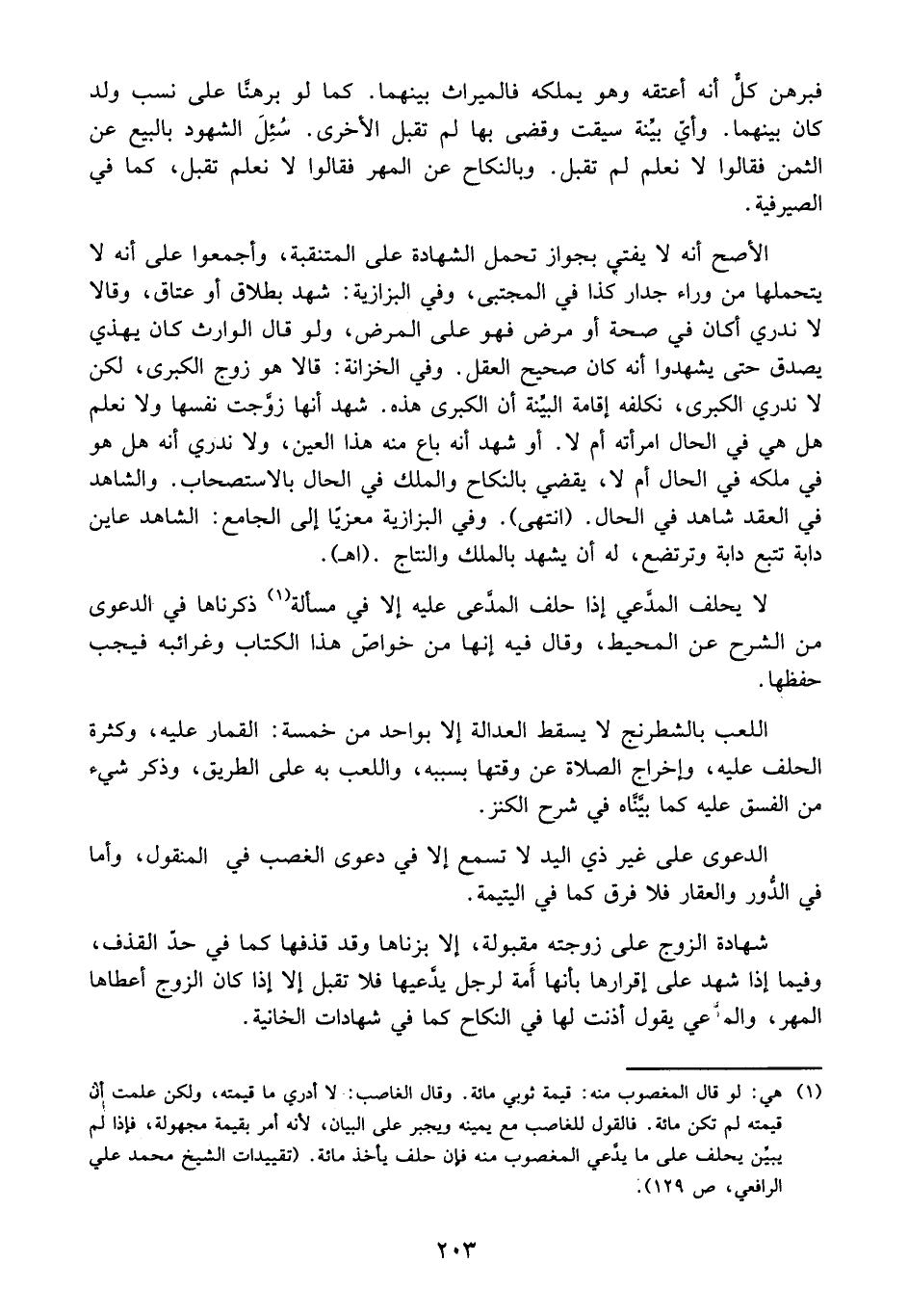 وَفِي الْبَزَّازِيَّةِ: شَهِدَا بِطَلَاقٍ أَوْ عَتَاقٍ، وَقَالَا: لَا نَدْرِي أَكَانَ فِي صِحَّةٍ أَوْ مَرَضٍ فَهُوَ عَلَى الْمَرَضِ، وَلَوْ قَالَ الْوَارِثُ: كَانَ يَهْذِي؛ يُصَدَّقُ حَتَّى يَشْهَدُوا أَنَّهُ كَانَ صَحِيحَ الْعَقْلِ وَفِي الْخِزَانَةِ: قَالَا: هُوَ زَوْجُ الْكُبْرَى، لَكِنْ لَا نَدْرِي الْكُبْرَى، نُكَلِّفُهُ إقَامَةَ الْبَيِّنَةِ أَنَّ الْكُبْرَى هَذِهِ.