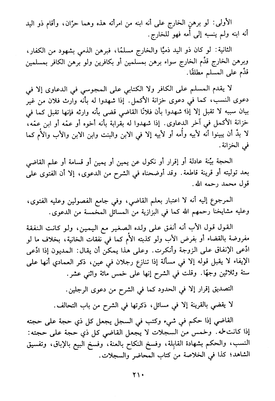 الثَّانِيَةُ: لَوْ كَانَ ذُو الْيَدِ ذِمِّيًّا وَالْخَارِجُ مُسْلِمًا، فَبَرْهَنَ الذِّمِّيُّ بِشُهُودٍ مِنْ الْكُفَّارِ، وَبَرْهَنَ الْخَارِجُ قُدِّمَ الْخَارِجُ سَوَاءٌ بَرْهَنَ بِمُسْلِمِينَ أَوْ بِكَافِرِينَ وَلَوْ بَرْهَنَ الْكَافِرُ بِمُسْلِمِينَ قُدِّمَ عَلَى الْمُسْلِمِ مُطْلَقًا لَا يُقَدَّمُ الْمُسْلِمُ عَلَى الْكَافِرِ وَلَا الْكِتَابِيُّ عَلَى الْمَجُوسِيِّ فِي الدَّعَاوَى إلَّا فِي دَعْوَى النَّسَبِ، كَمَا فِي دَعْوَى خِزَانَةِ الْأَكْمَلِ إذَا شَهِدُوا لَهُ بِأَنَّهُ وَارِثُ فُلَانٍ مِنْ غَيْرِ بَيَانِ سَبَبِهِ لَا تُقْبَلُ إلَّا إذَا شَهِدُوا بِأَنَّ فُلَانًا الْقَاضِيَ قَضَى بِأَنَّهُ وَارِثُهُ فَإِنَّهَا تُقْبَلُ كَمَا فِي خِزَانَةِ الْأَكْمَلِ فِي آخِرِ الدَّعَاوَى إذَا شَهِدُوا لَهُ بِقَرَابَةٍ بِأَنَّهُ أَخُوهُ أَوْ عَمُّهُ أَوْ ابْنُ عَمِّهِ، لَا بُدَّ أَنْ يُبَيِّنُوا أَنَّهُ لِأَبِيهِ وَأُمِّهِ أَوْ لِأَبِيهِ.