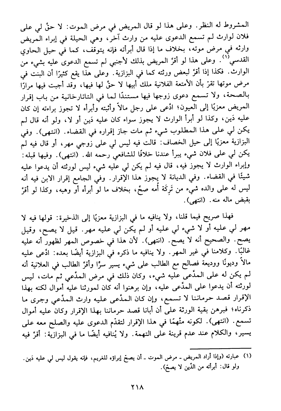 فَكَذَا إذَا أَقَرَّ لِبَعْضِ وَرَثَتِهِ كَمَا فِي الْبَزَّازِيَّةِ وَعَلَى هَذَا يَقَعُ كَثِيرًا أَنَّ الْبِنْتَ فِي مَرَضِ مَوْتِهَا تُقِرُّ بِأَنَّ الْأَمْتِعَةَ الْفُلَانِيَّةَ مِلْكُ أَبُوهَا لَا حَقَّ لَهَا فِيهَا، وَقَدْ أَجَبْتُ فِيهَا مِرَارًا بِالصِّحَّةِ، وَلَا تُسْمَعُ دَعْوَى زَوْجِهَا فِيهَا مُسْتَنِدًا لِمَا فِي التَّتَارْخَانِيَّة مِنْ بَابِ إقْرَارِ الْمَرِيضِ مَعْزِيًّا إلَى الْعُيُونِ؛ ادَّعَى عَلَى رَجُلٍ مَالًا وَأَثْبَتَهُ وَأَبْرَأَهُ لَا تَجُوزُ بَرَاءَتُهُ إنْ كَانَ عَلَيْهِ دَيْنٌ،