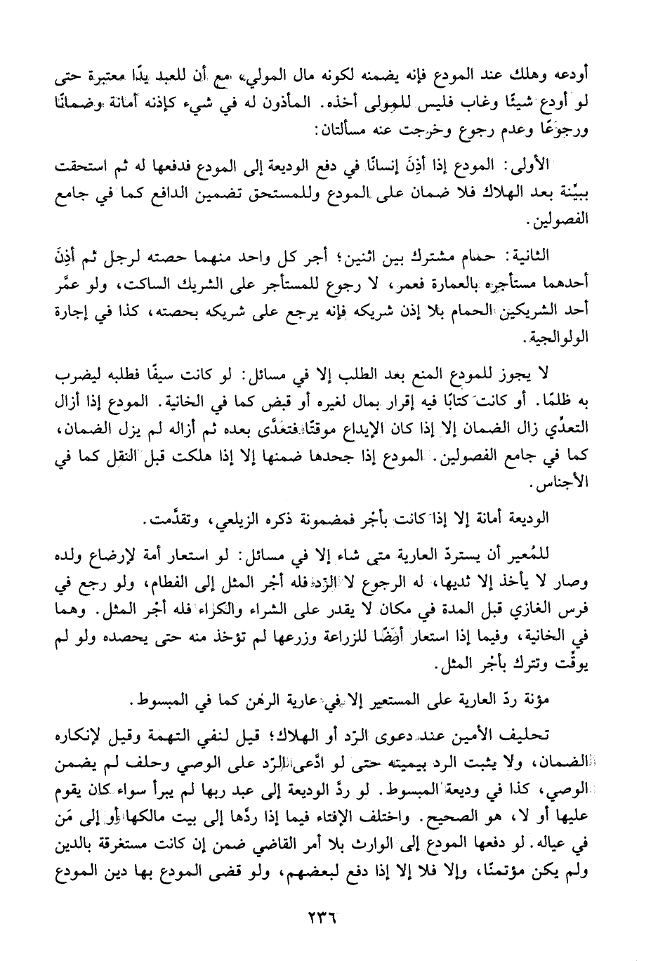 أَوْدَعَهُ وَهَلَكَ عِنْدَ الْمُودَعِ فَإِنَّهُ يَضْمَنُهُ لِكَوْنِهِ مَالَ الْمَوْلَى، مَعَ أَنَّ لِلْعَبْدِ يَدًا مُعْتَبَرَةً حَتَّى لَوْ أَوْدَعَ شَيْئًا وَغَابَ فَلَيْسَ لِلْمَوْلَى أَخْذُهُ الْمَأْذُونُ لَهُ فِي شَيْءٍ كَإِذْنِهِ أَمَانَةً وَضَمَانًا وَرُجُوعًا وَعَدَمَ رُجُوعٍ وَخَرَجَتْ عَنْهُ مَسْأَلَتَانِ: