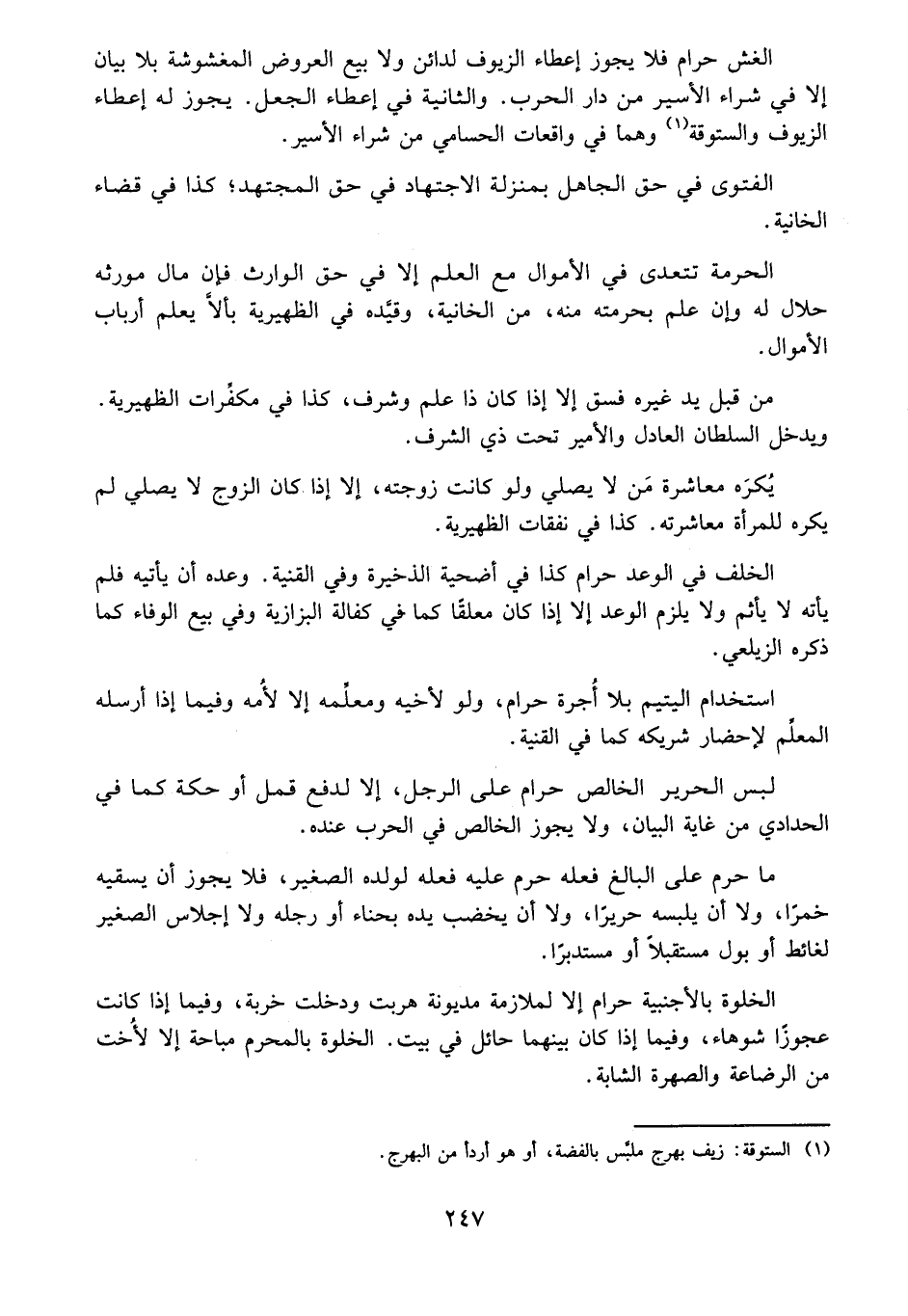 اسْتِخْدَامُ الْيَتِيمِ بِلَا أُجْرَةٍ حَرَامٌ، وَلَوْ لِأَخِيهِ وَمُعَلِّمِهِ إلَّا لِأُمِّهِ، وَفِيمَا إذَا أَرْسَلَهُ الْمُعَلِّمُ لِإِحْضَارِ شَرِيكِهِ كَمَا فِي الْقُنْيَةِلُبْسُ الْحَرِيرِ الْخَالِصِ حَرَامٌ عَلَى الرَّجُلِ، إلَّا لِدَفْعِ قَمْلٍ أَوْ حَكَّةٍ كَمَا فِي الْحَدَّادِيِّ مِنْ غَايَةِ الْبَيَانِ، وَلَا يَجُوزُ الْخَالِصُ فِي الْحَرْبِ عِنْدَهُمَا حُرِّمَ عَلَى الْبَالِغِ فِعْلُهُ حُرِّمَ عَلَيْهِ فِعْلُهُ لِوَلَدِهِ الصَّغِيرِ، فَلَا يَجُوزُ أَنْ يَسْقِيَهُ خَمْرًا، وَلَا أَنْ يُلْبِسَهُ حَرِيرًا، وَلَا أَنْ يُخَضِّبَ يَدَهُ بِحِنَّاءٍ أَوْ رِجْلَهُ وَلَا إجْلَاسَ الصَّغِيرِ لِغَائِطٍ أَوْ بَوْلٍ مُسْتَقْبِلًا أَوْ مُسْتَدْبِرًا.