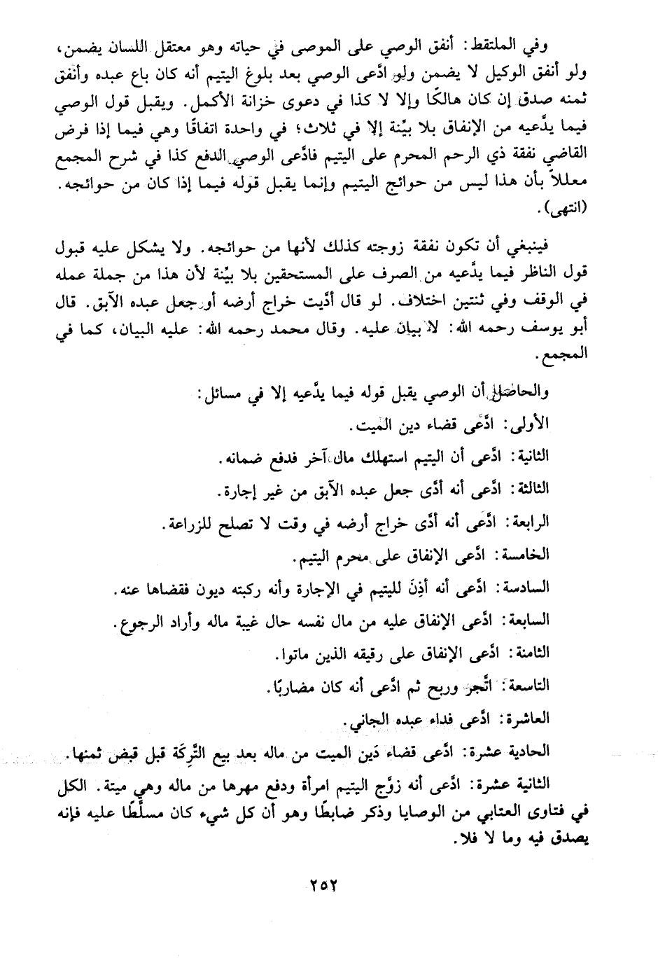 وَالْحَاصِلُ أَنَّ الْوَصِيَّ يُقْبَلُ قَوْلُهُ فِيمَا يَدَّعِيهِ إلَّا فِي مَسَائِلَ: الْأُولَى: ادَّعَى قَضَاءَ دَيْنِ الْمَيِّتِ.