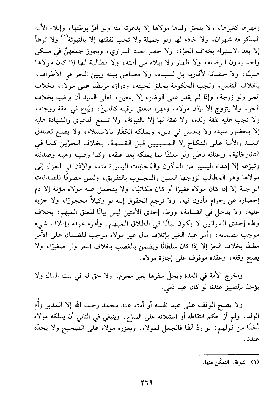 بِخِلَافِ الْحُرِّ، وَلَا يَتَزَوَّجُ إلَّا بِإِذْنِ مَوْلَاهُ، وَمَهْرُهُ مُتَعَلِّقٌ بِرَقَبَتِهِ كَالدَّيْنِ، وَيُبَاعُ فِي نَفَقَةِ زَوْجَتِهِ، وَلَا تَجِبُ عَلَيْهِ نَفَقَةُ وَلَدِهِ، وَلَا نَفَقَةَ لَهَا إلَّا بِالتَّبْوِئَةِ، وَلَا تُسْمَعُ الدَّعْوَى وَالشَّهَادَةُ عَلَيْهِ إلَّا بِحُضُورِ سَيِّدِهِ وَلَا يُحْبَسُ فِي دَيْنٍ، وَيَمْلِكُهُ الْكُفَّارُ بِالِاسْتِيلَاءِ، وَلَا يَصِحُّ تَصَادُقُ الْعَبْدِ وَالْأَمَةِ عَلَى النِّكَاحِ إلَّا فِي الْمُسَبَّبِينَ قَبْلَ الْقِسْمَةِ، بِخِلَافِ الْحُرَّيْنِ كَمَا فِي التَّتَارْخَانِيَّة، وَإِعْتَاقُهُ بَاطِلٌ وَلَوْ مُعَلَّقًا بِمَا يَمْلِكُهُ بَعْدَ عِتْقِهِ، وَكَذَا وَصِيَّتُهُ وَهِبَتُهُ وَصَدَقَتُهُ وَتَبَرُّعُهُ إلَّا إهْدَاءَ الْيَسِيرِ مِنْ الْمَأْذُونِ الْمُحَابَاةُ الْيَسِيرَةُ مِنْهُ، وَالْإِذْنُ فِي الْعَزْلِ إلَى مَوْلَاهَا وَهُوَ الْمَطَالِبُ لِزَوْجِهَا الْعِنِّينِ وَالْمَجْبُوبِ بِالتَّفْرِيقِ، وَلَيْسَ مَصْرِفًا لِلصَّدَقَاتِ الْوَاجِبَةِ إلَّا إذَا كَانَ مَوْلَاهُ فَقِيرًا أَوْ كَانَ مُكَاتَبًا، وَلَا يَتَحَمَّلُ عَنْهُ مَوْلَاهُ مُؤْنَةً إلَّا دَمَ إحْصَارِهِ عَنْ إحْرَامٍ مَأْذُونٍ فِيهِ، وَلَا تَرْجِعُ الْحُقُوقُ إلَيْهِ لَوْ وَكِيلًا مَحْجُورًا، وَلَا جِزْيَةَ عَلَيْهِ، وَلَا يَدْخُلُ فِي الْقَسَامَةِ وَوَطْءُ إحْدَى الْأَمَتَيْنِ لَيْسَ بِبَيَانٍ لِلْعِتْقِ الْمُبْهَمِ، بِخِلَافِ وَطْءِ إحْدَى الْمَرْأَتَيْنِ لَا يَكُونُ بَيَانًا فِي الطَّلَاقِ الْمُبْهَمِ وَأَمْرُهُ عَبْدَهُ بِإِتْلَافِ شَيْءٍ مُوجِبٌ لِضَمَانِهِ، وَأَمْرُ عَبْدِ الْغَيْرِ بِإِتْلَافِ مَالِ غَيْرِ مَوْلَاهُ مُوجِبٌ لِلضَّمَانِ عَلَى الْآمِرِ مُطْلَقًا بِخِلَافِ الْحُرِّ إلَّا إذَا كَانَ سُلْطَانًا، وَيُضْمَنُ بِالْغَصْبِ بِخِلَافِ الْحُرِّ وَلَوْ صَغِيرًا، وَلَا يَصِحُّ وَقْفُهُ، وَعَقْدُهُ مَوْقُوفٌ عَلَى إجَازَةِ مَوْلَاهُ وَتَخْرُجُ الْأَمَةُ فِي الْعِدَّةِ وَيَحِلُّ سَفَرُهَا بِغَيْرِ مَحْرَمٍ وَلَا حَقَّ لَهُ فِي بَيْتِ الْمَالِ وَلَا يُؤْخَذُ بِالتَّمْيِيزِ عَنَّا لَوْ كَانَ عَبْدَ ذِمِّيٍّ.