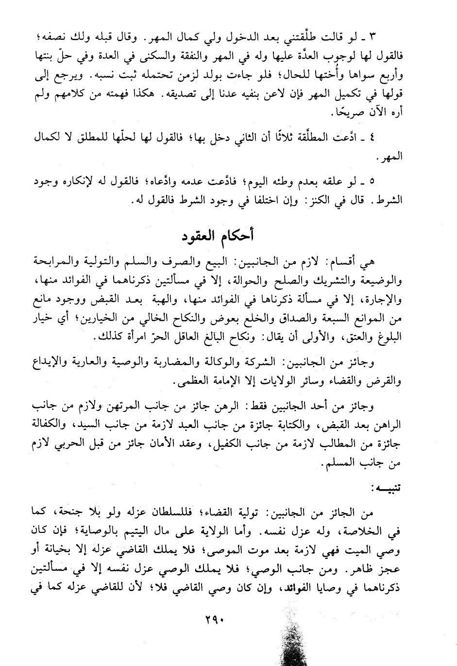 أَيْ خِيَارِ الْبُلُوغِ وَالْعِتْقِ، وَالْأَوْلَى أَنْ يُقَالَ: وَنِكَاحُ الْبَالِغِ الْعَاقِلِ الْحُرِّ امْرَأَةً كَذَلِكَوَجَائِزٌ مِنْ الْجَانِبَيْنِ: الشَّرِكَةُ وَالْوَكَالَةُ وَالْمُضَارَبَةُ وَالْوَصِيَّةُ وَالْعَارِيَّةُ وَالْإِيدَاعُ وَالْقَرْضُ وَالْقَضَاءُ وَسَائِرُ الْوِلَايَاتِ إلَّا الْإِمَامَةَ الْعُظْمَىوَجَائِزٌ مِنْ أَحَدِ الْجَانِبَيْنِ فَقَطْ: الرَّهْنُ جَائِزٌ مِنْ جَانِبِ الْمُرْتَهِنِ وَلَازِمٌ مِنْ جَانِبِ الرَّاهِنِ بَعْدَ الْقَبْضِ، وَالْكِتَابَةُ جَائِزَةٌ مِنْ جَانِبِ الْعَبْدِ لَازِمَةٌ مِنْ جَانِبِ السَّيِّدِ، وَالْكَفَالَةُ جَائِزَةٌ مِنْ الْمُطَالِبِ لَازِمَةٌ مِنْ جَانِبِ الْكَفِيلِ، وَعَقْدُ الْأَمَانِ جَائِزٌ مِنْ قِبَلِ الْحَرْبِيِّ لَازِمٌ مِنْ جَانِبِ الْمُسْلِمِ