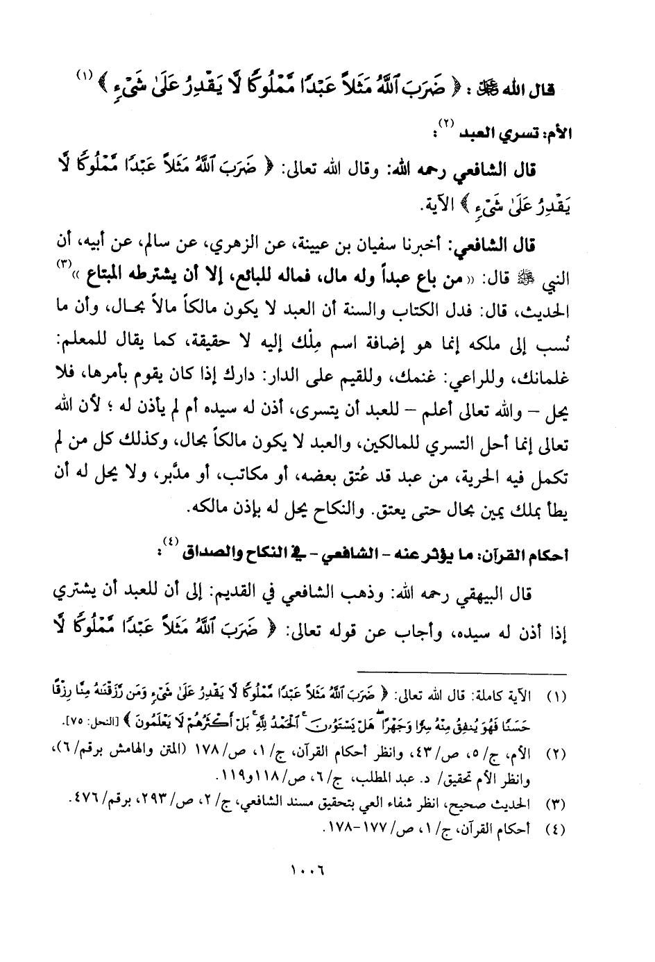 قال الشَّافِعِي رحمه الله: وقال اللَّه تعالى: (ضَرَبَ اللَّهُ مَثَلًا عَبْدًا مَمْلُوكًا لَا يَقْدِرُ عَلَى شَيْءٍ) الآية.