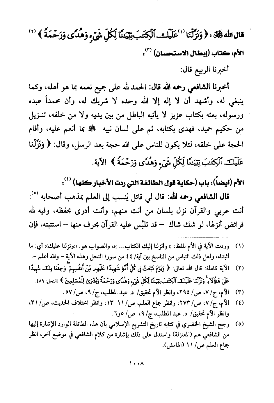 الأم (أيضاً) : باب (حكاية قول الطائفة التي ردت الأخبار كلها) :