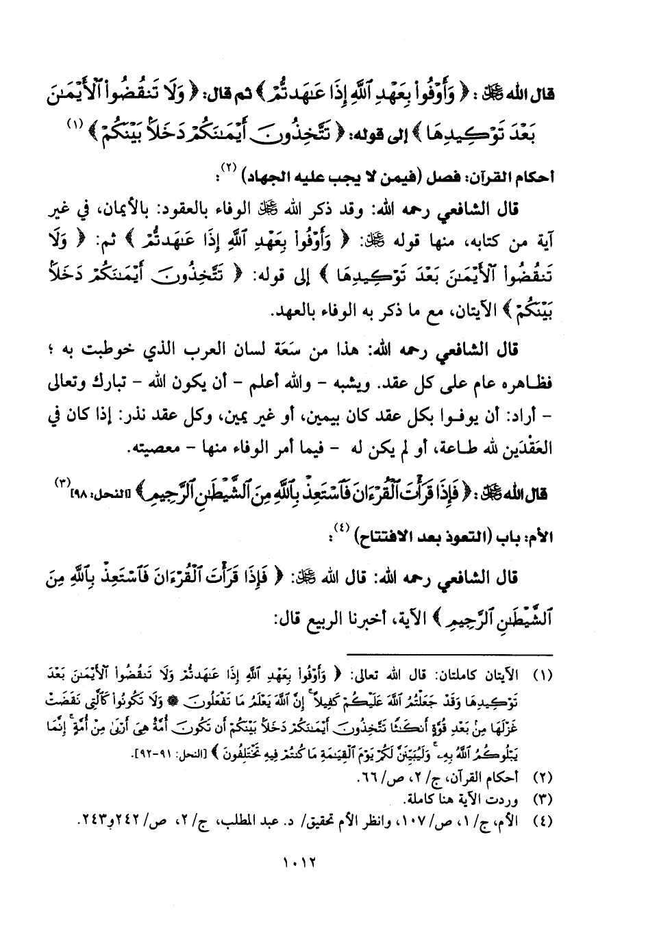 قال الشَّافِعِي رحمه الله: وقد ذكر الله - عزَّ وجلَّ الوفاء بالعقود: بالإيمان، في غير آية من كتابه، منها قوله: (وَأَوْفُوا بِعَهْدِ اللَّهِ إِذَا عَاهَدْتُمْ)