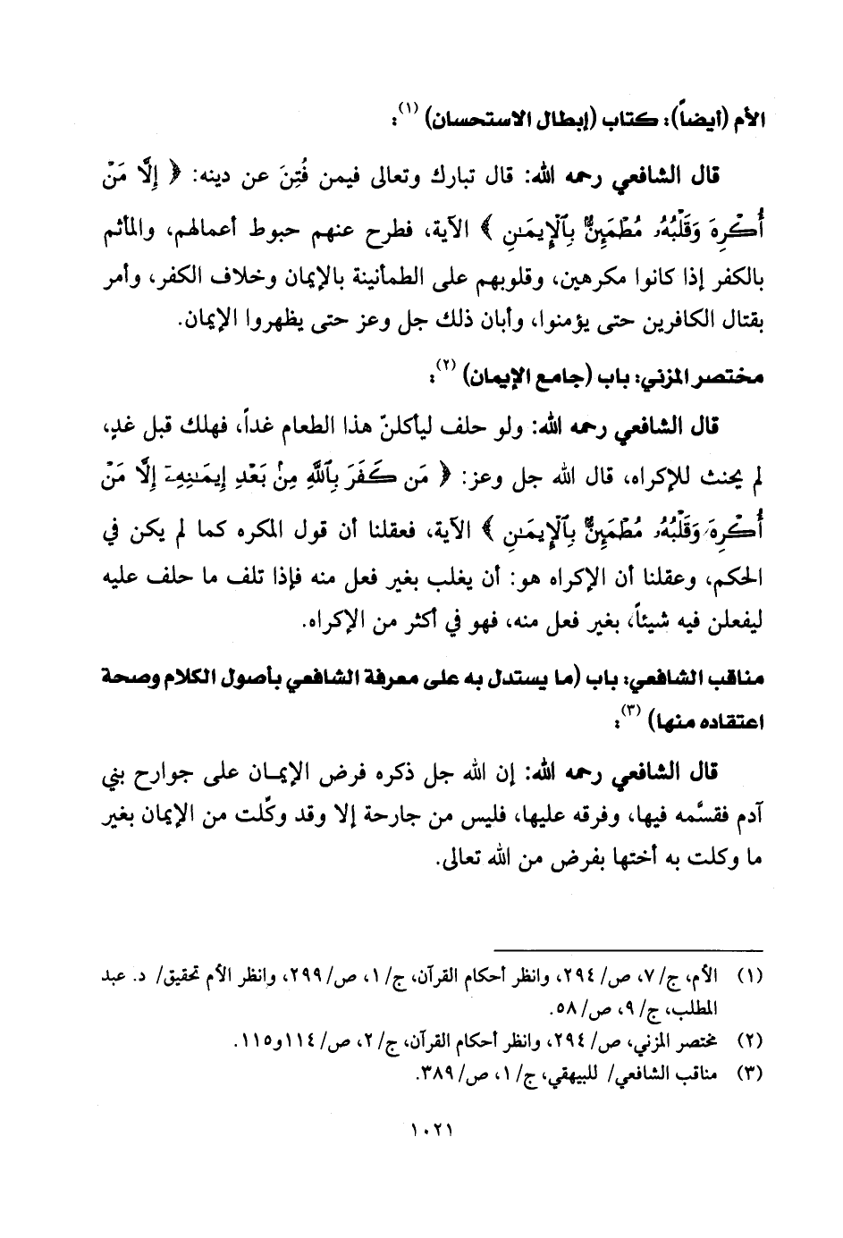 قال الشَّافِعِي رحمه الله: قال تبارك وتعالى فيمن فُتِنَ عن دينه: (مَنْ كَفَرَ بِاللَّهِ مِنْ بَعْدِ إِيمَانِهِ إِلَّا مَنْ أُكْرِهَ وَقَلْبُهُ مُطْمَئِنٌّ بِالْإِيمَانِ) الآية، فطرح عنهم حبوط أعمالهم، والمأثم بالكفر إذا كانوا مكرهين، وقلوبهم على الطمأنينة بالإيمان وخلاف الكفر، وأمر بقتال الكافرين حتى يؤمنوا، وأبان ذلك جل وعز حتى يظهروا الإيمان.