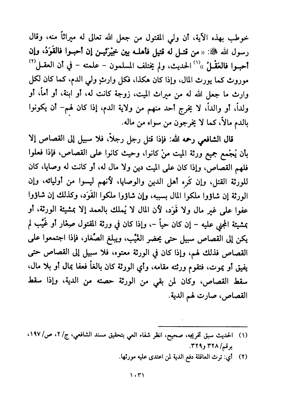 ولم يختلف المسلمون - علمته - في أن العقل موروث كما يورث المال، وإذا كان هكذا، فكل وارث ولي الدم، كما كان لكل وارث ما جعل اللَّه له من ميراث الميت، زوجة كانت له، أو ابنة، أو أماً، أو ولداً، أو والداً، لا يخرج أحد منهم من ولاية الدم، إذا كان لهم - أن يكونوا