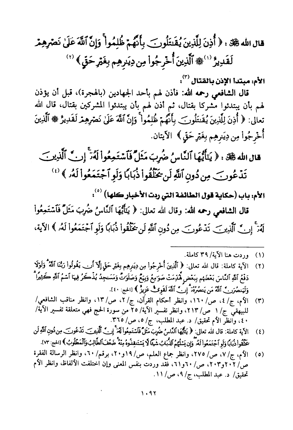 قال الشَّافِعِي رحمه الله: وقال اللَّه تعالى: (يَا أَيُّهَا النَّاسُ ضُرِبَ مَثَلٌ فَاسْتَمِعُوا لَهُ إِنَّ الَّذِينَ تَدْعُونَ مِنْ دُونِ اللَّهِ لَنْ يَخْلُقُوا ذُبَابًا وَلَوِ اجْتَمَعُوا لَهُ) الآية،