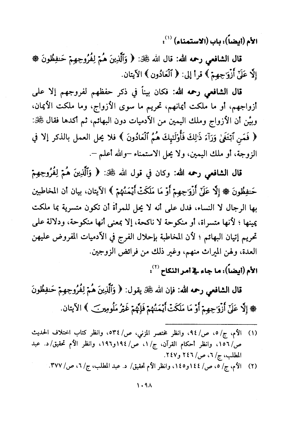 قال الشَّافِعِي رعه الله: وكان في قول اللَّه - عز وجل -: (وَالَّذِينَ هُمْ لِفُرُوجِهِمْ حَافِظُونَ (5) إِلَّا عَلَى أَزْوَاجِهِمْ أَوْ مَا مَلَكَتْ أَيْمَانُهُمْ) الآيتان.