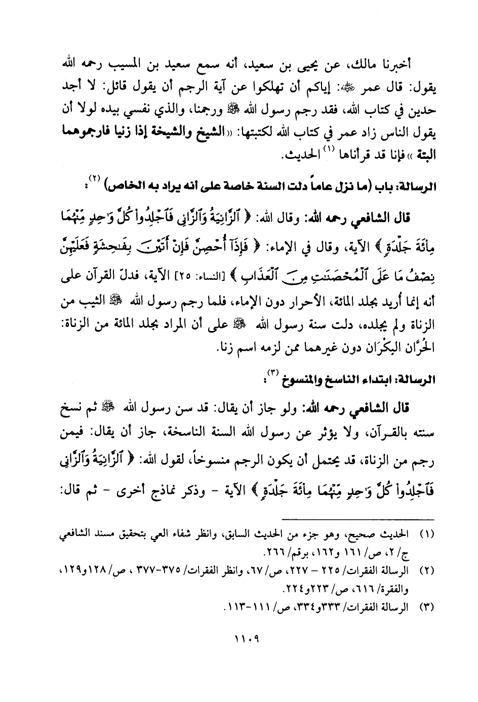 قال الشَّافِعِي رحمه الله: ولو جاز أن يقال: قد سنَّ رسول الله - صلى الله عليه وسلم - ثم نسخ سنته بالقرآن، ولا يؤثر عن رسول الله السنة الناسخة، جاز أن يقال: فيمن رجم من الزناة، قد يحتمل أن يكون الرجم منسوخاً، لقول اللَّه: (الزَّانِيَةُ وَالزَّانِي فَاجْلِدُوا كُلَّ وَاحِدٍ مِنْهُمَا مِائَةَ جَلْدَةٍ) الآية -