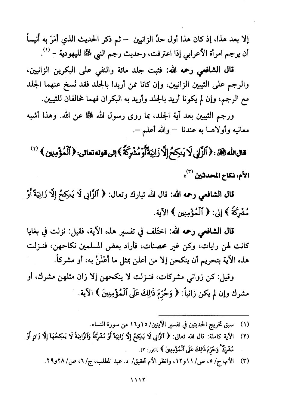 قال الشَّافِعِي رحمه الله: قال الله تبارك وتعالى: (الزَّانِي لَا يَنْكِحُ إِلَّا زَانِيَةً أَوْ مُشْرِكَةً وَالزَّانِيَةُ لَا يَنْكِحُهَا إِلَّا زَانٍ أَوْ مُشْرِكٌ وَحُرِّمَ ذَلِكَ عَلَى الْمُؤْمِنِينَ (3) .