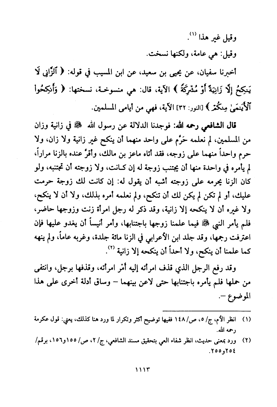 قال الشَّافِعِي رحمه الله: فوجدنا الدلالة عن رسول الله - صلى الله عليه وسلم - في زانية وزان من المسلمين، لم نعلمها حَرَّم على واحد منهما أن ينكح غير زانية ولا زان، ولا حرم واحداً منهما على زوجه، فقد أتاه ماعز بن مالك، وأقرَّ عنده بالزنا مراراً، لم يأمره في واحدة منها أن يجتنب زوجة له إن كانت، ولا زوجته أن تجتنبه، ولو كان الزنا يحرمه على زوجته أشبه أن يقول له: إن كانت لك زوجة حرمت عليك، أو لم تكن لم يكن لك أن تنكح، ولم نعلمه أمره بذلك، ولا أن لا ينكح.