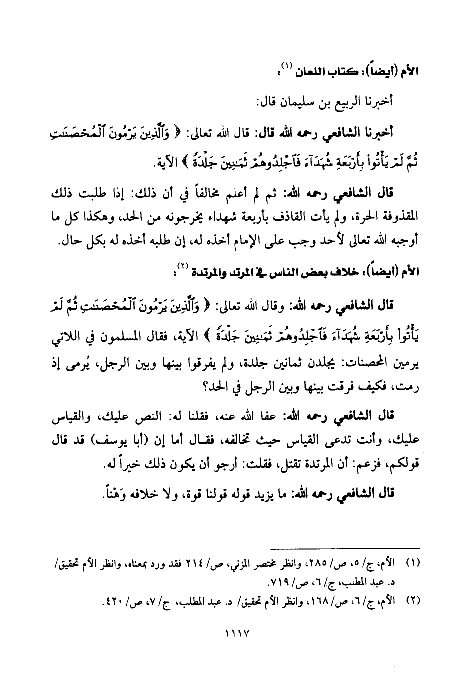 قال الشَّافِعِي رحمه الله: وقال اللَّه تعالى: (وَالَّذِينَ يَرْمُونَ الْمُحْصَنَاتِ ثُمَّ لَمْ يَأْتُوا بِأَرْبَعَةِ شُهَدَاءَ فَاجْلِدُوهُمْ ثَمَانِينَ جَلْدَةً) الآية.
