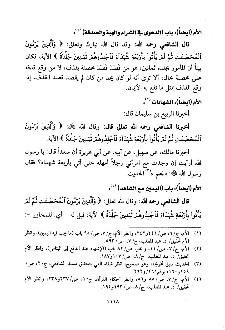 قال الشَّافِعِي رحمه الله: وقد قال اللَّه تبارك وتعالى: (وَالَّذِينَ يَرْمُونَ الْمُحْصَنَاتِ ثُمَّ لَمْ يَأْتُوا بِأَرْبَعَةِ شُهَدَاءَ فَاجْلِدُوهُمْ ثَمَانِينَ جَلْدَةً) الآية.