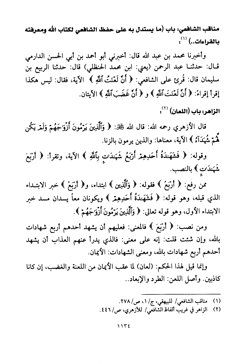 قال الأزهري رحمه الله: قال الله عزَّ وجلَّ: (وَالَّذِينَ يَرْمُونَ أَزْوَاجَهُمْ وَلَمْ يَكُنْ لَهُمْ شُهَدَاءُ) الآية.