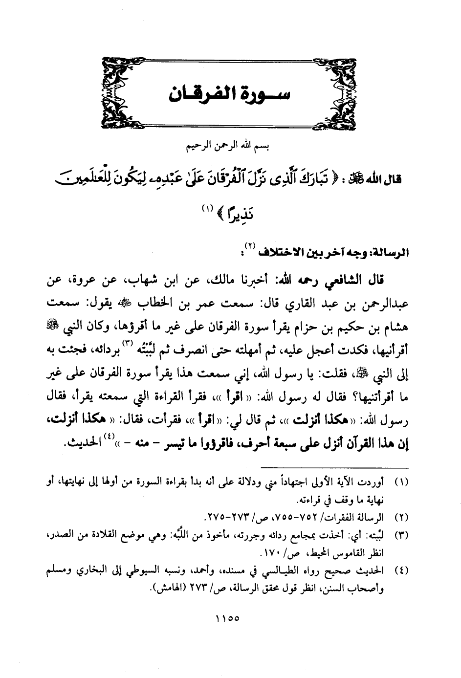 عبد الرحمن بن عبد القاري قال: سمعت عمر بن الخطاب - رضي الله عنه - يقول: سمعت هشام بن حكيم بن حزام يقرأ سورة الفرقان على غير ما أقرؤها، وكان النبي - صلى الله عليه وسلم - أقرأنيها، فكدت أعجل عليه، ثم أمهلته حتى انصرف ثم لبَّبتُه بردائه، فجئت به إلى النبي - صلى الله عليه وسلم -، فقلت: يا رسول اللَّه، إني سمعت هذا يقرأ سورة الفرقان على غير ما أقرأتنيها؛ فقال له رسول اللَّه: "اقرأ"، فقرأ القراءة التي سمعته يقرأ، فقال رسول اللَّه: "هكذا أنزلت"، ثم قال لي: "اقرأ"، فقرأت، فقال: هكذا أنزلت، إن هذا القرآن أُنزل على سبعة أحرف، فاقرؤوا ما تيسر منه" الحديث.
