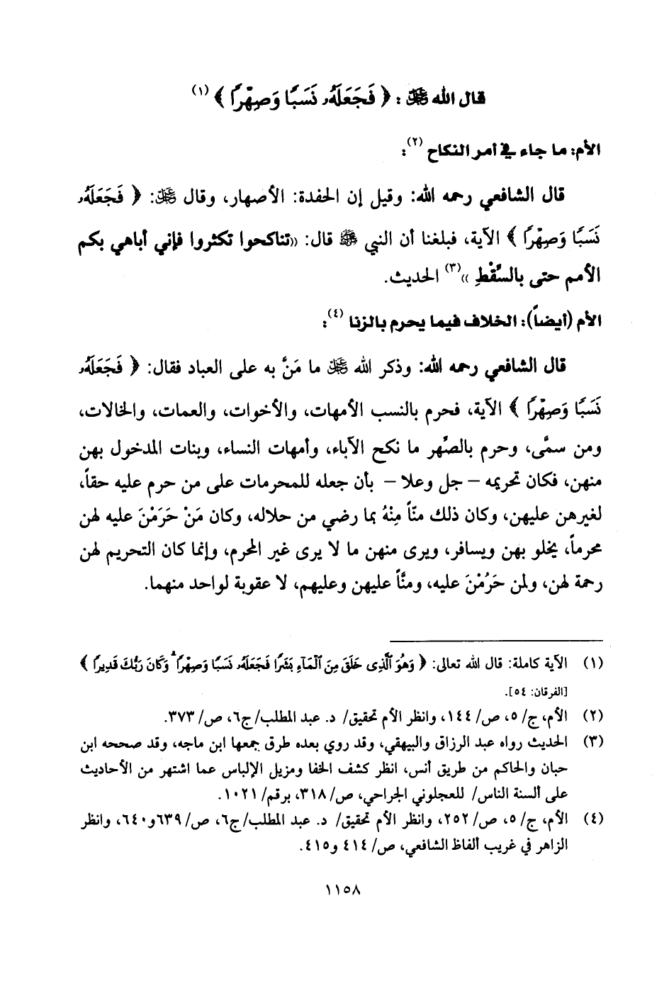 قال الشَّافِعِي رحمه الله: وفيل إن الحفدة: الأصهار، وقال عزَّ وجلَّ: (فَجَعَلَهُ نَسَبًا وَصِهْرًا) الآية، فبلغنا أن النبي - صلى الله عليه وسلم - قال: "تناكحوا تكثروا فإني أباهي بكم الأمم حتى بالسِّقطِ" الحديث.