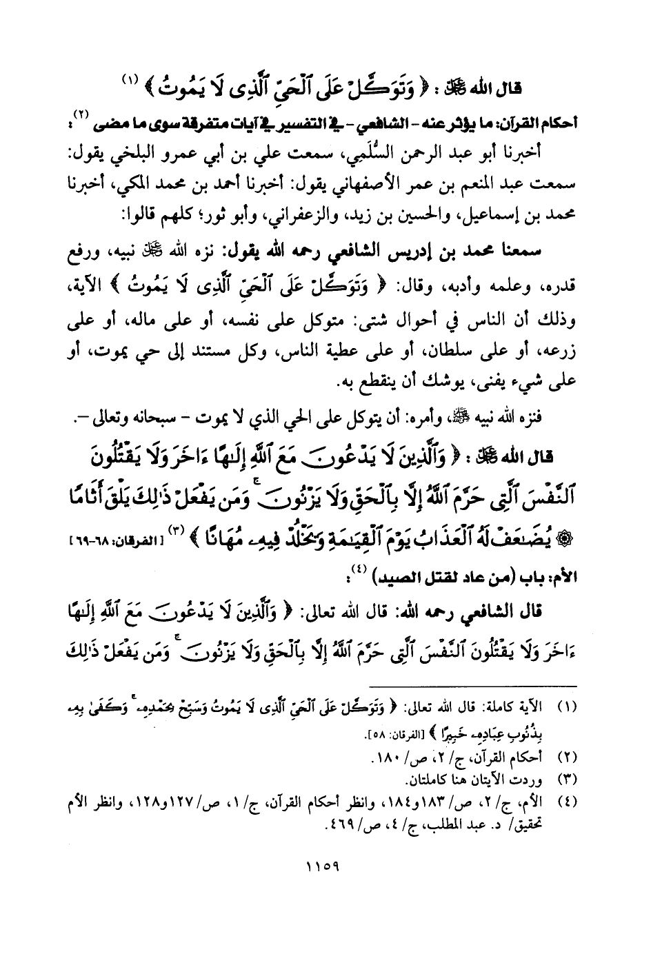 قال الشَّافِعِي رحمه الله: قال اللَّه تعالى: (وَالَّذِينَ لَا يَدْعُونَ مَعَ اللَّهِ إِلَهًا آخَرَ وَلَا يَقْتُلُونَ النَّفْسَ الَّتِي حَرَّمَ اللَّهُ إِلَّا بِالْحَقِّ وَلَا يَزْنُونَ وَمَنْ يَفْعَلْ ذَلِكَ يَلْقَ أَثَامًا (68) يُضَاعَفْ لَهُ الْعَذَابُ يَوْمَ الْقِيَامَةِ وَيَخْلُدْ فِيهِ مُهَانًا (69)