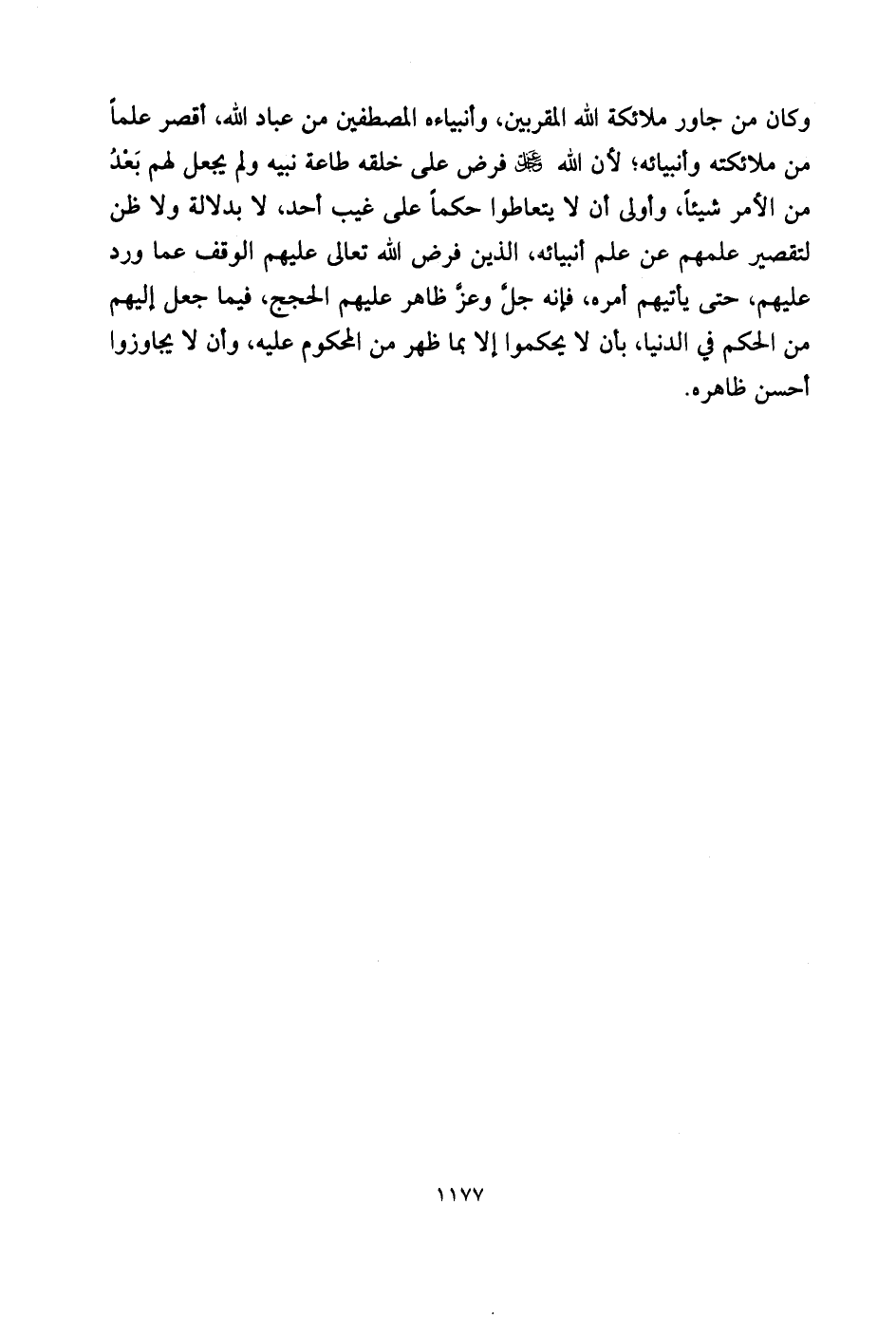 وكان من جاور ملائكة اللَّه المقربين، وأنبياءه المصطفين من عباد الله، أقصر علماً من ملائكته وأنبيائه؛ لأن اللَّه - عز وجل - فرض على خلقه طاعة نبيه ولم يجعل لهم بَعدُ من الأمر شيئاً، وأولى أن لا يتعاطوا حكماً على غيب أحد، لا بدلالة ولا ظن لنفصير علمهم عن علم أنبيائه، الذين فرض اللَّه تعالى عليهم الوقف عما ورد عليهم، حتى يأتيهم أمره، فإنه جل وعز ظاهر عليهم الحجج، فيما جعل إليهم من الحكم في الدنيا، بأن لا يحكموا إلا بما ظهر من المحكوم عليه، وأن لا يجاوزوا أحسن ظاهره.