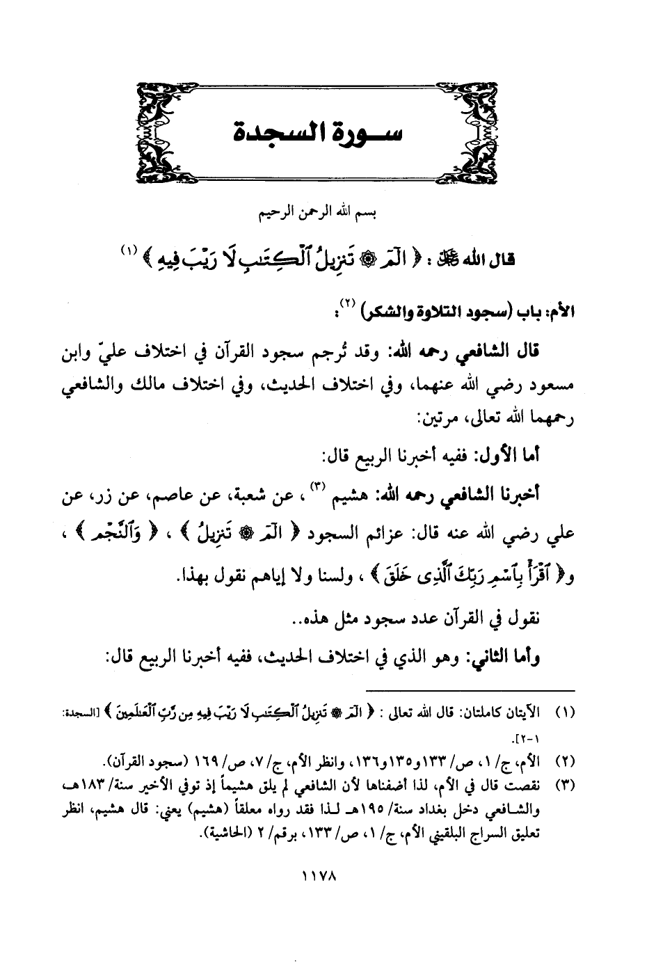 قال الشَّافِعِي رحمه الله: وقد ترجم سجود القرآن في اختلاف علي وابن