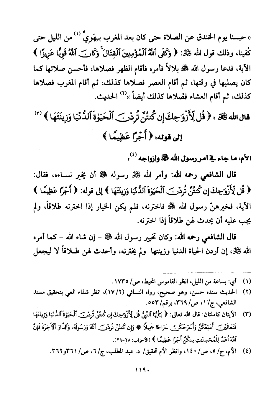 قال الشَّافِعِي رحمه الله: وأمر الله - عزَّ وجلَّ - رسوله - صلى الله عليه وسلم - أن يخير نساءه، فقال: