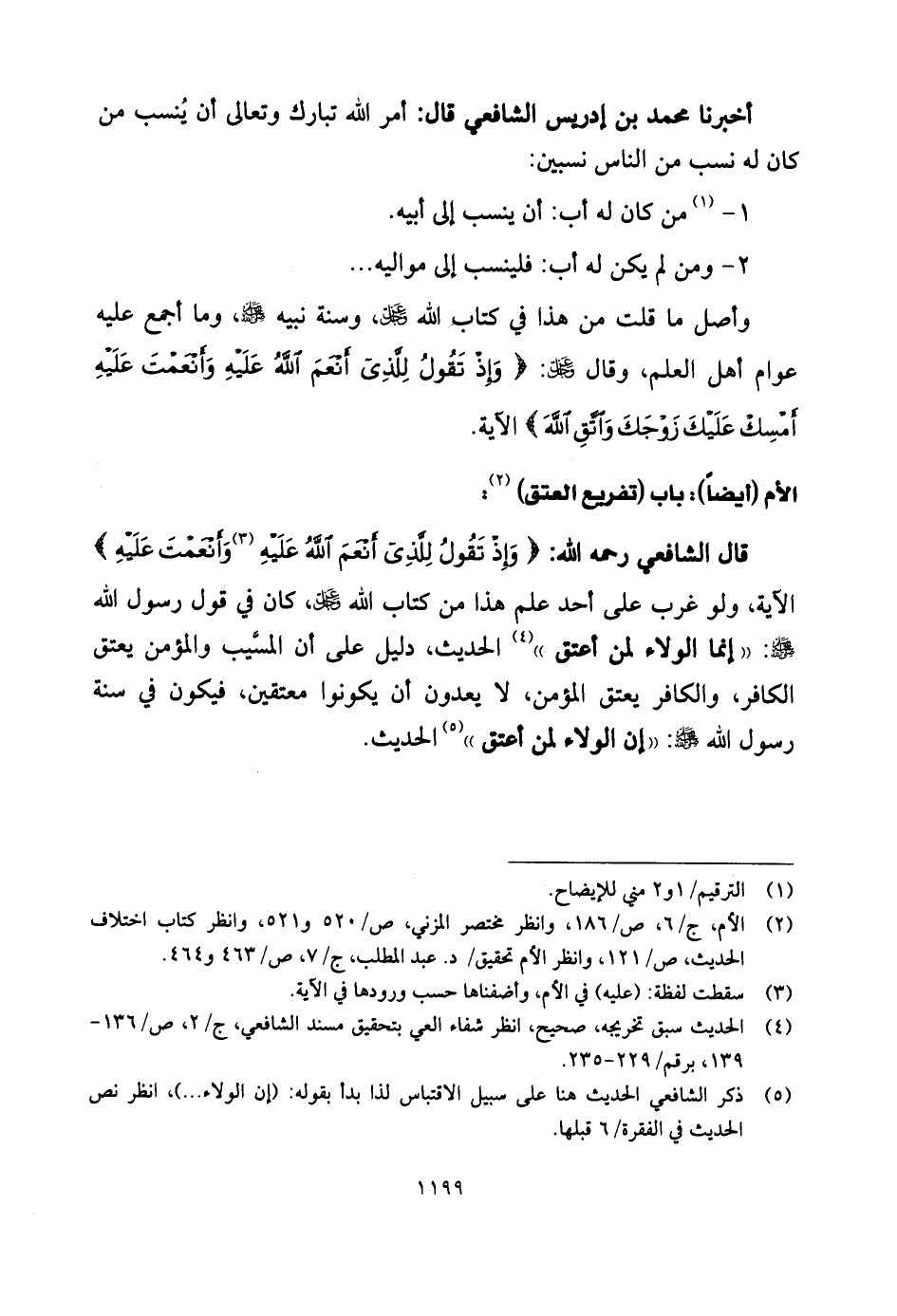 أخبرنا محمد بن إدريس الشَّافِعِي قال: أمر اللَّه تبارك وتعالى أن يُنسب من