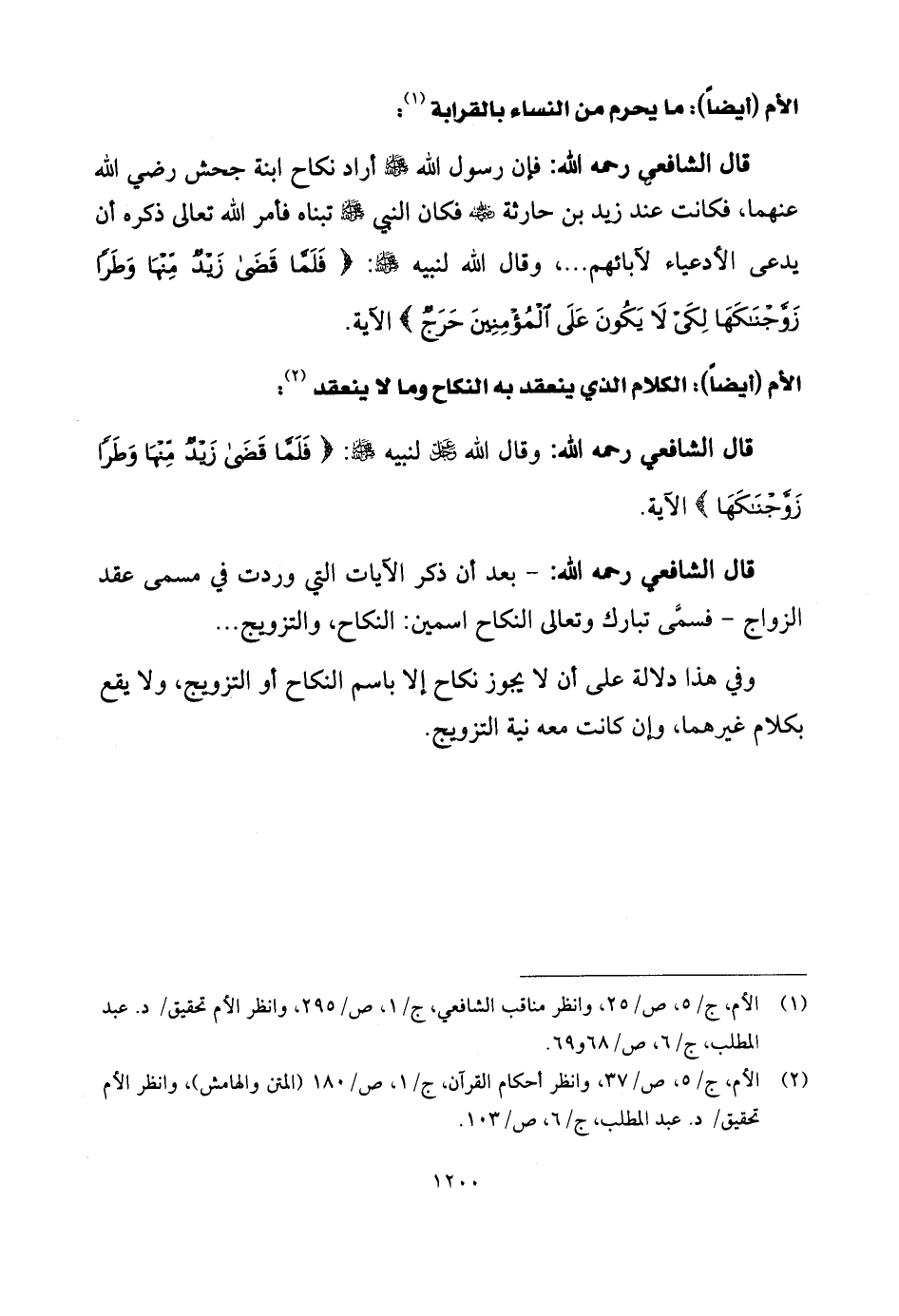 قال الشَّافِعِي رحمه الله: وقال اللَّه - عز وجل - لنبيه - صلى الله عليه وسلم -: (فَلَمَّا قَضَى زَيْدٌ مِنْهَا وَطَرًا زَوَّجْنَاكَهَا) الآية.