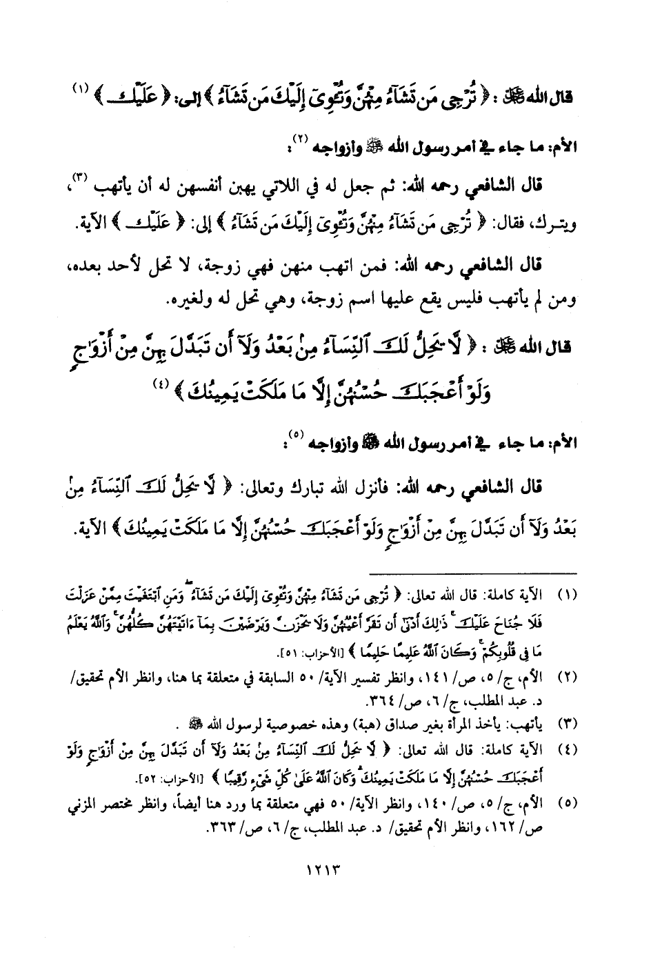 قال الشَّافِعِي رحمه الله: فأنزل اللَّه تبارك وتعالى: (لَا يَحِلُّ لَكَ النِّسَاءُ مِنْ بَعْدُ وَلَا أَنْ تَبَدَّلَ بِهِنَّ مِنْ أَزْوَاجٍ وَلَوْ أَعْجَبَكَ حُسْنُهُنَّ إِلَّا مَا مَلَكَتْ يَمِينُكَ) الآية.