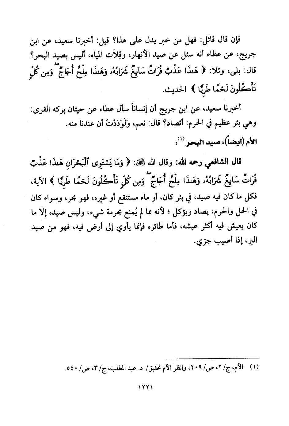 قال الشَّافِعِي رحمه الله: وقال الله - عزَّ وجلَّ -: ((وَمَا يَسْتَوِي الْبَحْرَانِ هَذَا عَذْبٌ فُرَاتٌ سَائِغٌ شَرَابُهُ وَهَذَا مِلْحٌ أُجَاجٌ وَمِنْ كُلٍّ تَأْكُلُونَ لَحْمًا طَرِيًّا)) الآية، فكل ما كان فيه صيد، في بئر كان، أو ماء مستنقع أو غيره، فهو بحر، وسواء كان في الحل والحرم، يصاد ويؤكل؛ لأنه مما لم يُمنع بحرمة شيء، وليس صيده إلا ما كان يعيش فيه أكثر عيشه، فأما طائره فإنما يأوي إلى أرض فيه، فهو من صيد البر، إذا أصيب جزي.