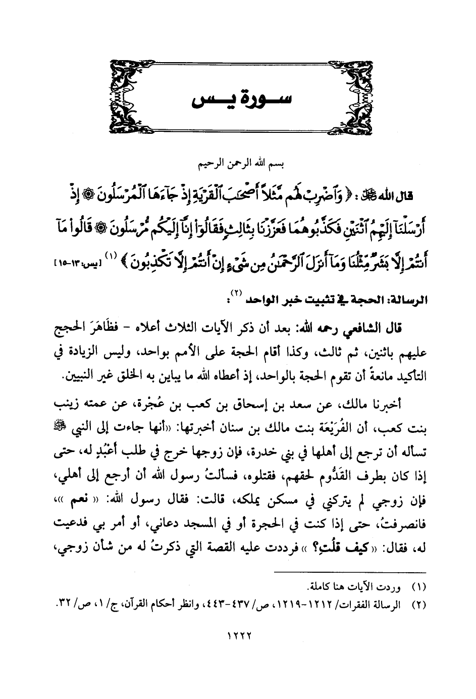 الرسالة: الحجة في تثبيت خبر الواحد: