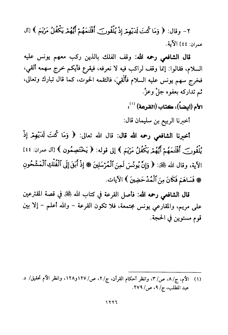 أخبرنا الشَّافِعِي رحمه الله قال: قال اللَّه تعالى: (وَمَا كُنْتَ لَدَيْهِمْ إِذْ يُلْقُونَ أَقْلَامَهُمْ أَيُّهُمْ يَكْفُلُ مَرْيَمَ وَمَا كُنْتَ لَدَيْهِمْ إِذْ يَخْتَصِمُونَ (44) .