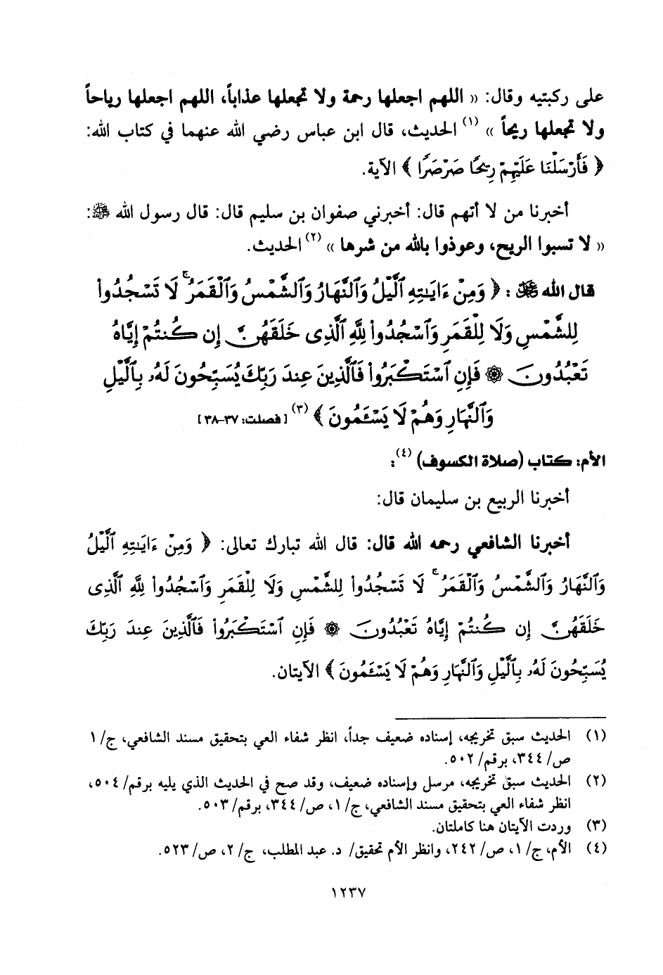 أخبرنا الشَّافِعِي رحمه الله قال: قال اللَّه تبارك تعالى: (وَمِنْ آيَاتِهِ اللَّيْلُ وَالنَّهَارُ وَالشَّمْسُ وَالْقَمَرُ لَا تَسْجُدُوا لِلشَّمْسِ وَلَا لِلْقَمَرِ وَاسْجُدُوا لِلَّهِ الَّذِي خَلَقَهُنَّ إِنْ كُنْتُمْ إِيَّاهُ تَعْبُدُونَ (37) فَإِنِ اسْتَكْبَرُوا فَالَّذِينَ عِنْدَ رَبِّكَ يُسَبِّحُونَ لَهُ بِاللَّيْلِ وَالنَّهَارِ وَهُمْ لَا يَسْأَمُونَ (38) .