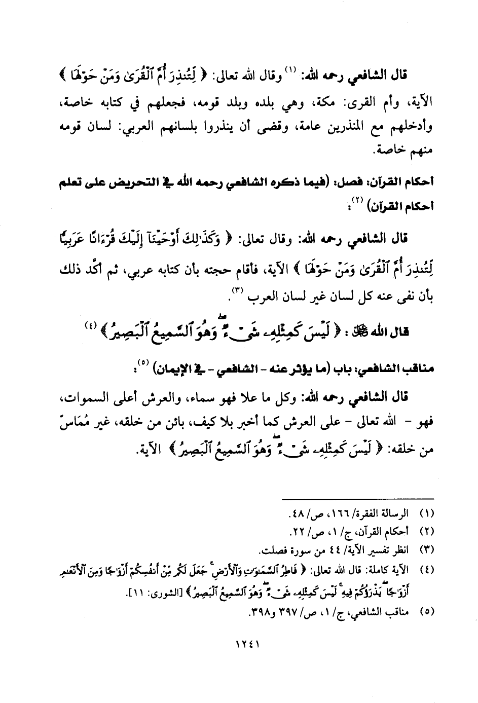قال الشَّافِعِي رحمه الله: وقال تعالى: (وَكَذَلِكَ أَوْحَيْنَا إِلَيْكَ قُرْآنًا عَرَبِيًّا لِتُنْذِرَ أُمَّ الْقُرَى وَمَنْ حَوْلَهَا) الآية.