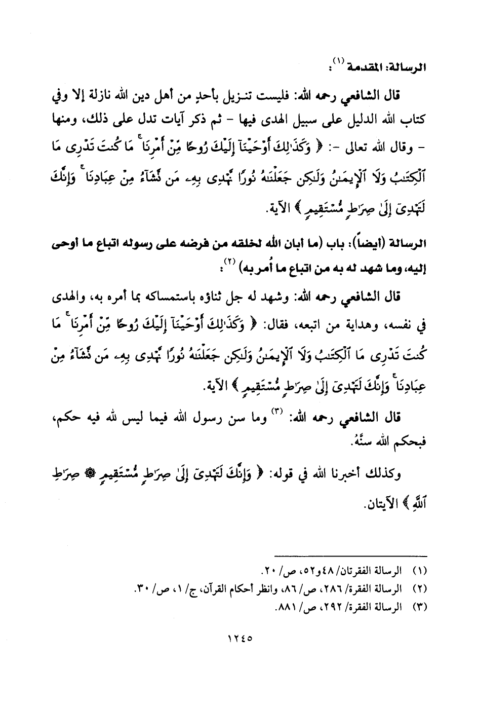 كتاب اللَّه الدليل على سبيل الهدى فيها - ثم ذكر آيات تدل على ذلك، ومنها - وقال الله تعالى -: (وَكَذَلِكَ أَوْحَيْنَا إِلَيْكَ رُوحًا مِنْ أَمْرِنَا مَا كُنْتَ تَدْرِي مَا الْكِتَابُ وَلَا الْإِيمَانُ وَلَكِنْ جَعَلْنَاهُ نُورًا نَهْدِي بِهِ مَنْ نَشَاءُ مِنْ عِبَادِنَا وَإِنَّكَ لَتَهْدِي إِلَى صِرَاطٍ مُسْتَقِيمٍ) .
