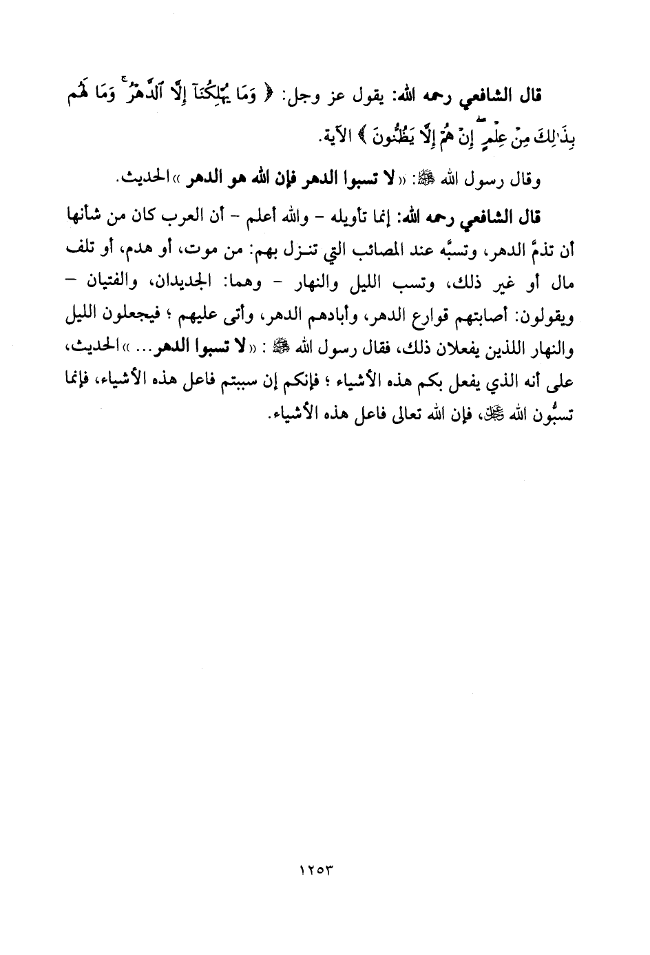 قال الشَّافِعِي رحمه الله: يقول عز وجل: (وَقَالُوا مَا هِيَ إِلَّا حَيَاتُنَا الدُّنْيَا نَمُوتُ وَنَحْيَا وَمَا يُهْلِكُنَا إِلَّا الدَّهْرُ وَمَا لَهُمْ بِذَلِكَ مِنْ عِلْمٍ إِنْ هُمْ إِلَّا يَظُنُّونَ) .