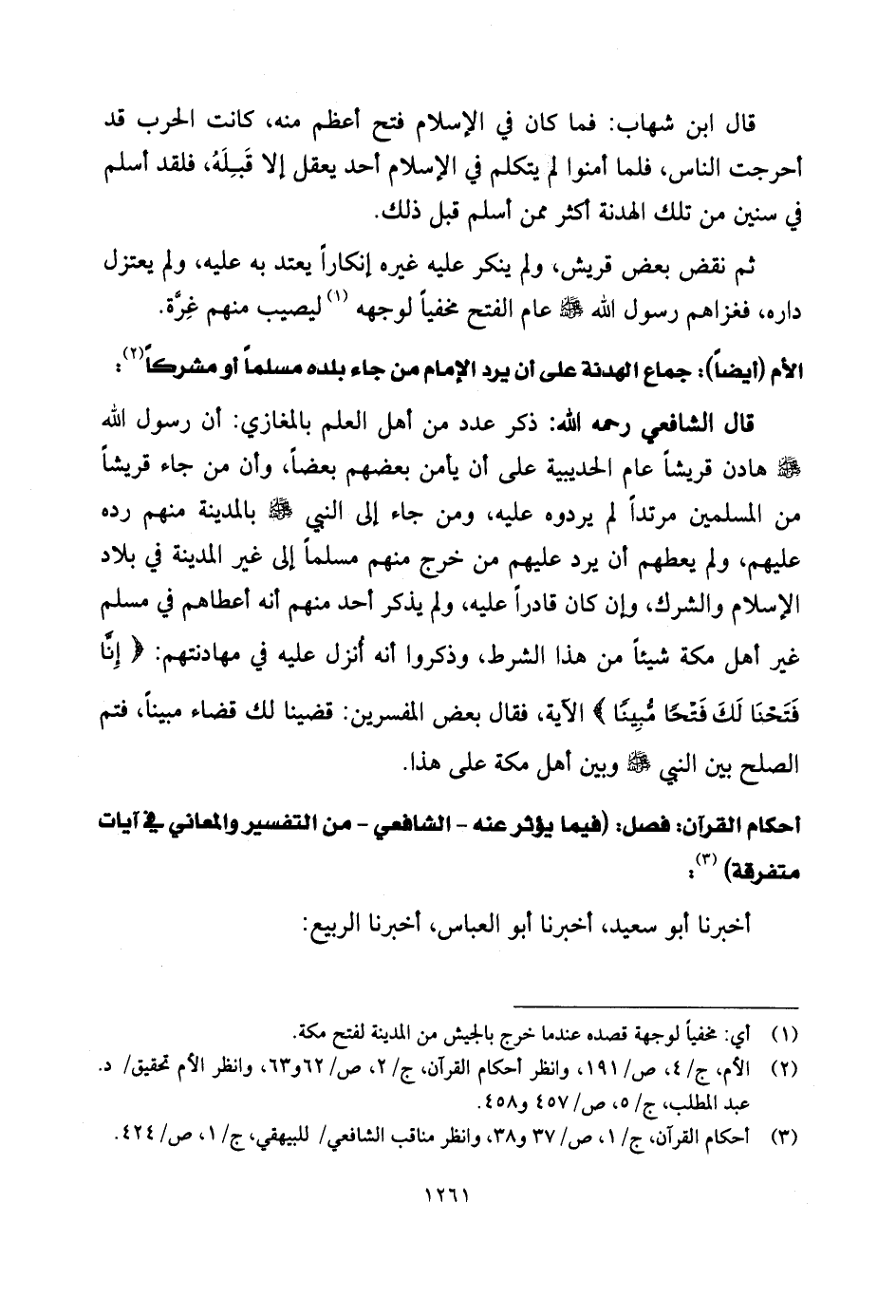 الأم (أيضاً) : جماع الهدنة على أن يردَّ الإمام من جاء بلده مسلماً أو مشركاً: قال الشَّافِعِي رحمه الله: ذكر عدد من أهل العلم بالمغازي: أن رسول اللَّه